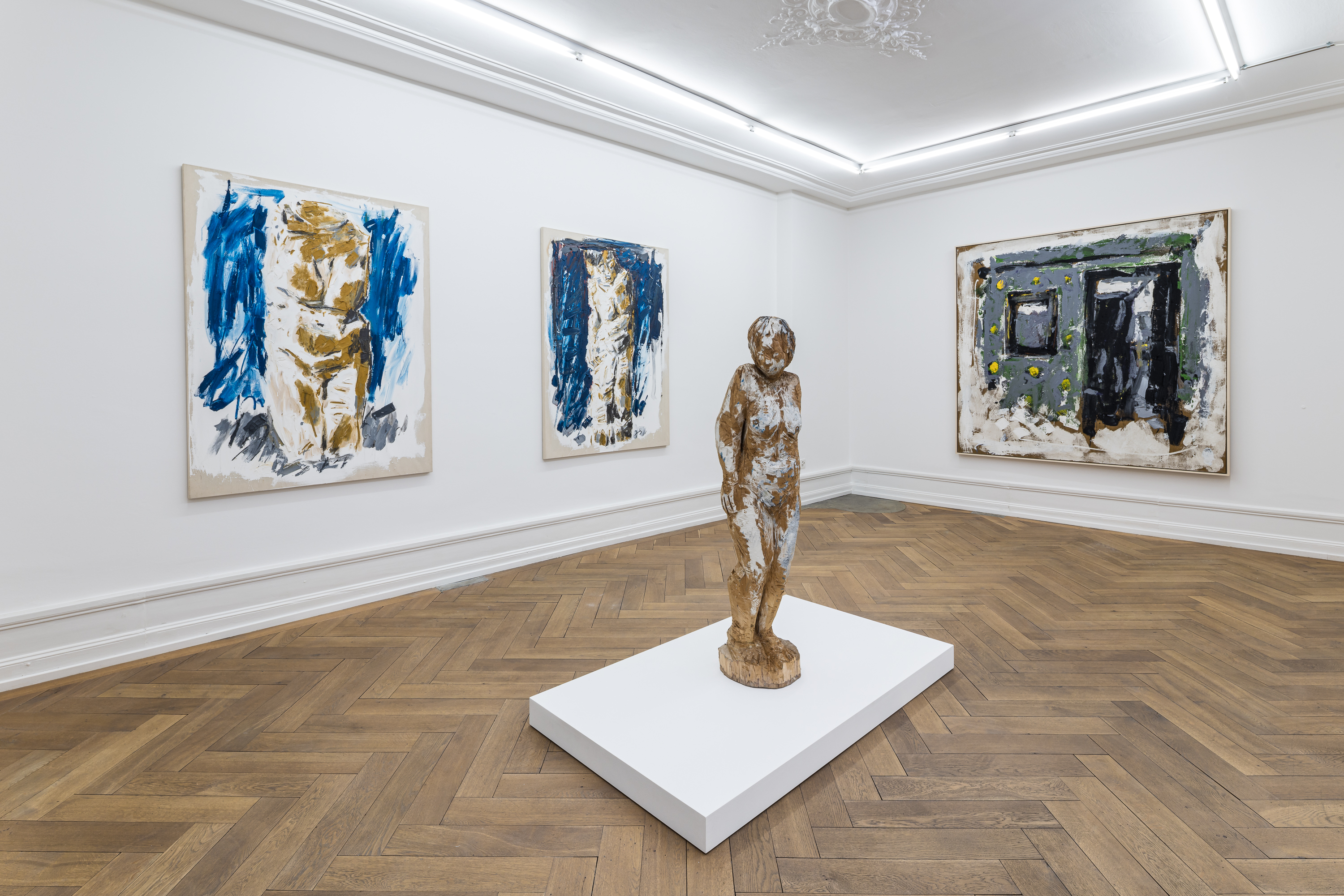 After exhibiting geometric sculptures and conceptual photographs, Christian Lindow began to paint in an illustrative style. Before long, his paint thickened, became more gestural, and his motifs became indistinguishable from brisk, broad brushstrokes that characterize the overall architecture of his paintings. While the artist’s output from 1977 onward seems to fall squarely within the then-dominant currents of Germanic Neo-Expressionism, Lindow’s paintings sever the association we have come to take for granted between, on the one hand, the discernible intensity and speed of their execution and, on the other, the expression of the artist’s subjectivity. The vast majority of his paintings feature a single, central motif. Selected for their ubiquitous quality, they appear to us as readymade images. And even when he selects subjects that come from his immediate surroundings, such as his own recent figurative wooden sculptures, or his wife’s face, the quality (or lack thereof) of his reproductive treatment suggests an already mediated origin. —Fabrice Stroun