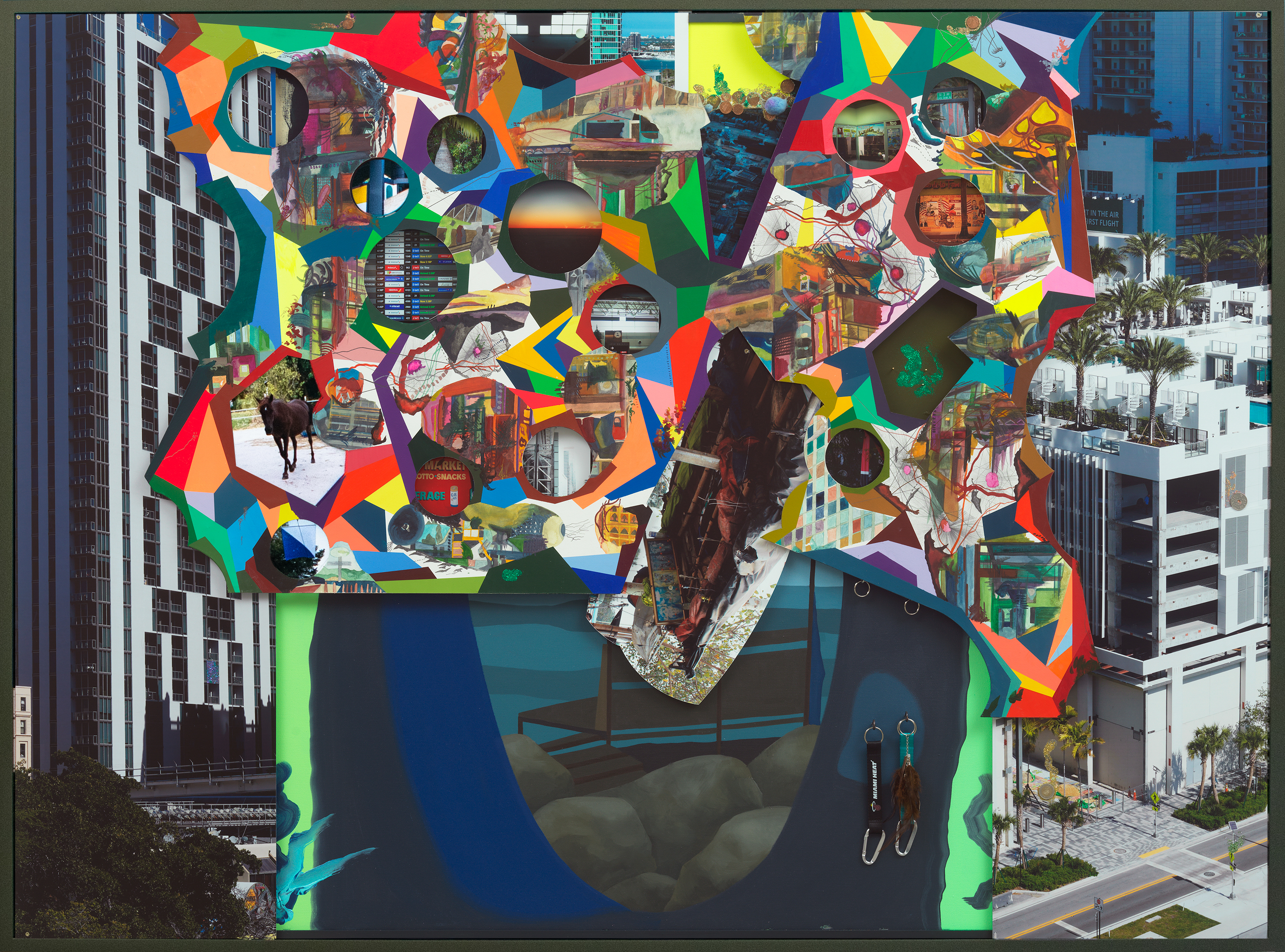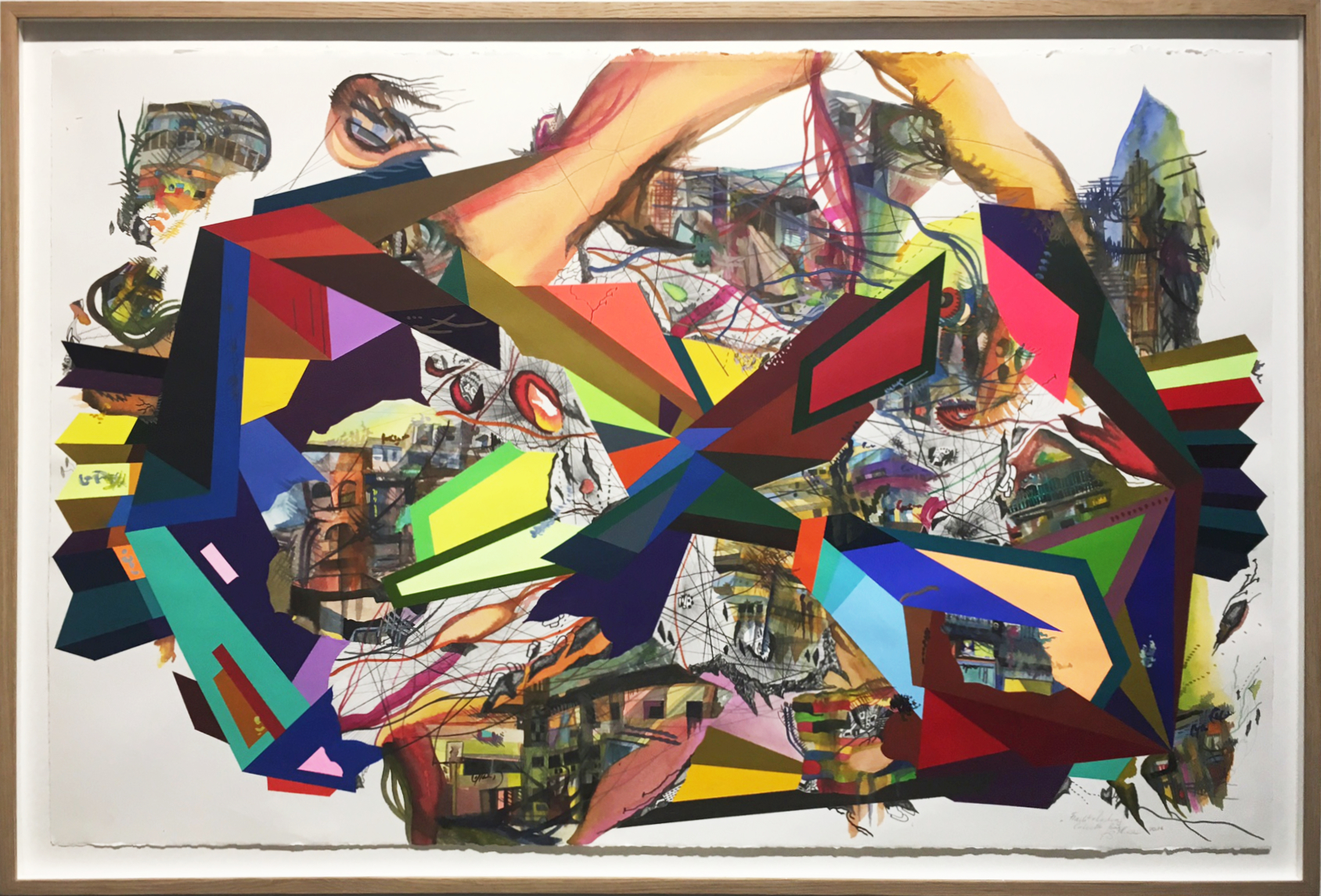 Ackermann’s focus is on visual expressions of modern urbanity. Architectural elements occur frequently in his works, either as drawings, photographs or paintings. He sets the centuries-old idealized image of the city against his own highly subjective impression of contemporary reality in the metropolis of today. In his paintings and collage-like images, and in his sometimes gigantic wall installations, fantastical spatial perspectives unfold: abstract colour fields whirling around disintegrating central structures seem to physically tumble towards the viewer. —Axel Jablonski