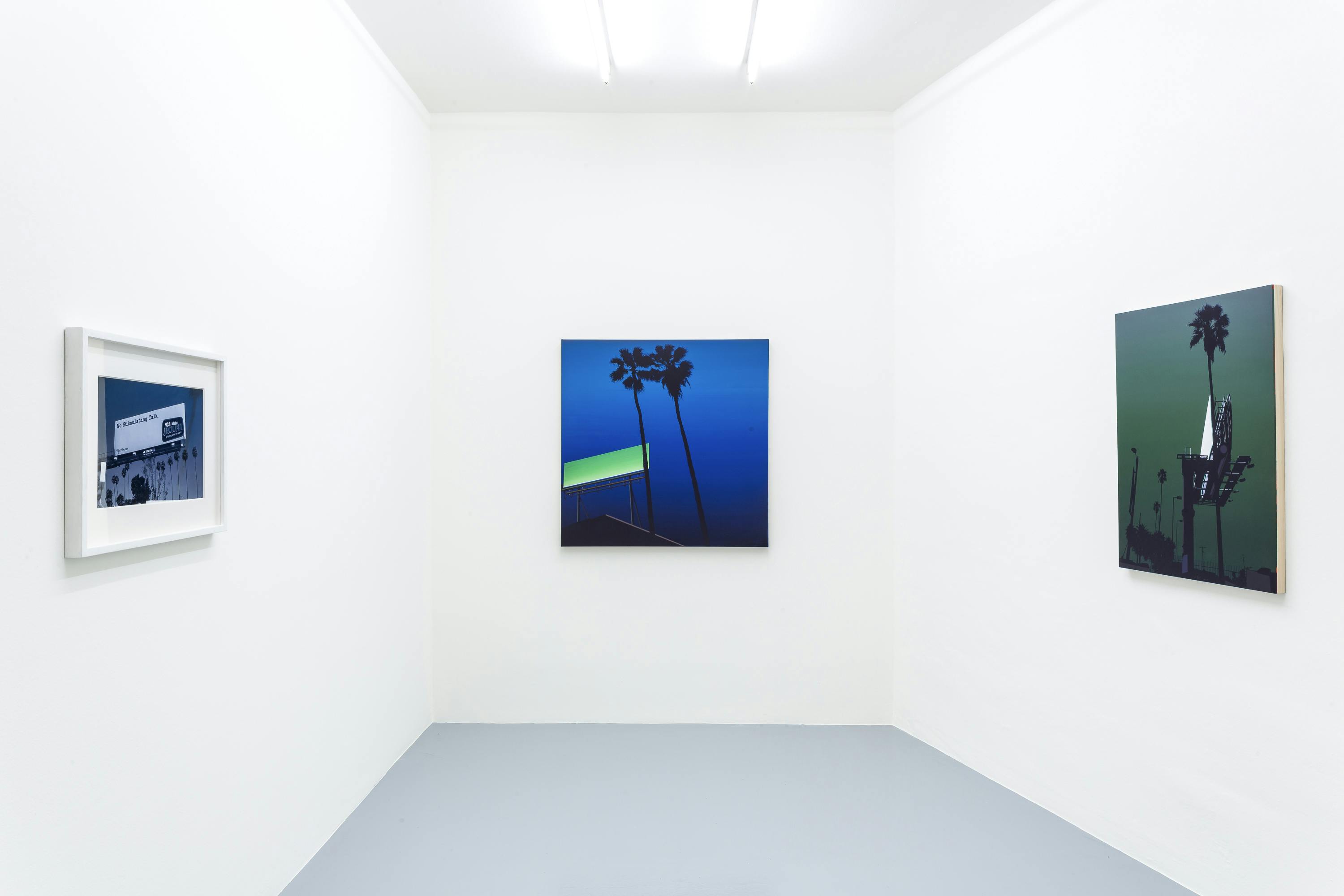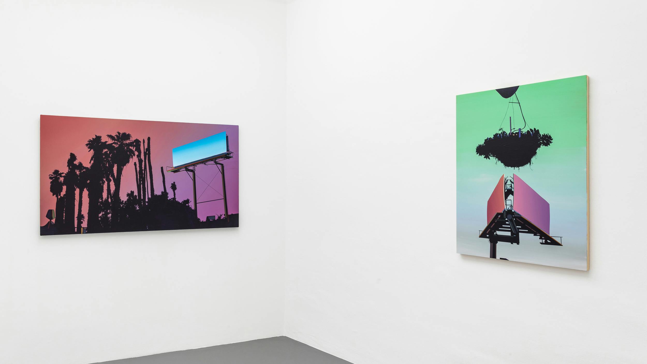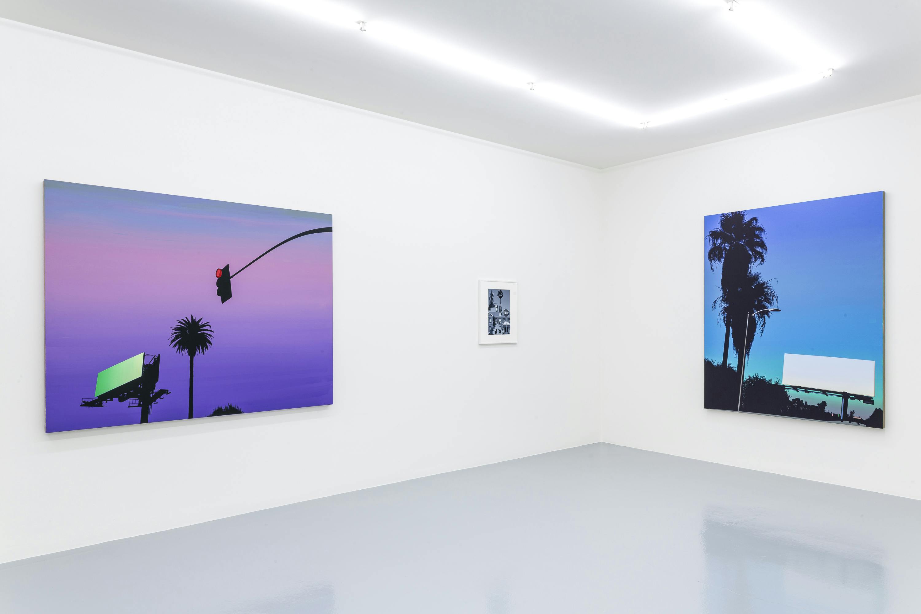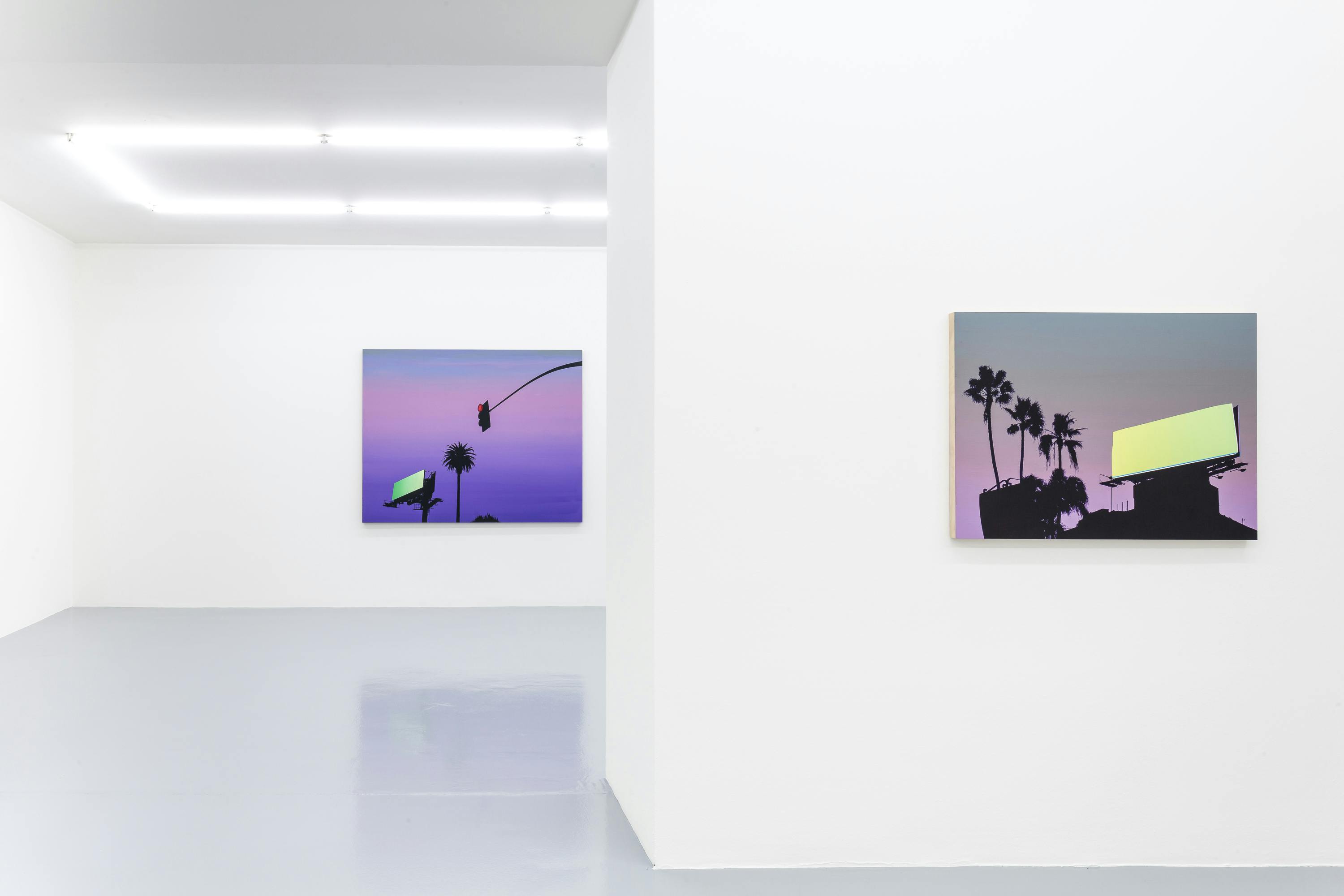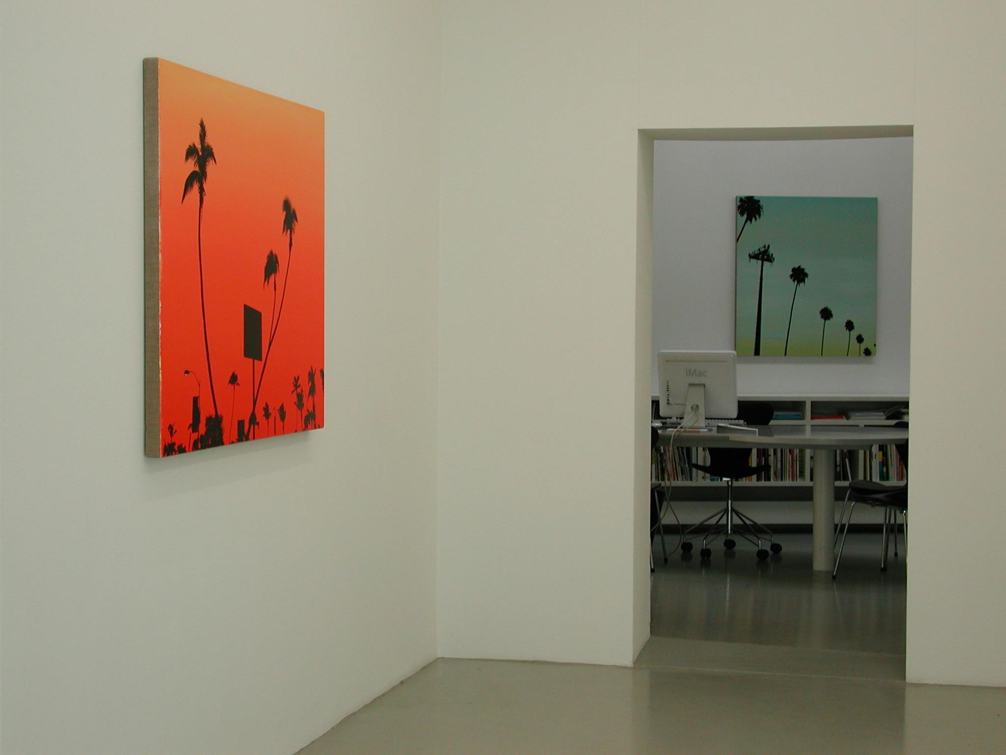 Glen Rubsamen’s craft is painting, which he treats as a traditionally established medium. Yet what appears at first glance to be traditional is at the same time the very source of Rubsamen’s subversiveness. His scenic and artistic views invariably play out against an impressive celestial backdrop that contrasts sharply and spectacularly with the silhouette-like black figures arrayed in the foreground – figures, incidentally, that cannot move; not just because they are painted, but also because they are usually things that are rooted to the spot, such as trees, antennae, and more recently, huge billboards. In spite of their immobility, they are protagonists in the sense that they narrate so much. Their narrative comes from their role serving as representatives of overarching themes. The images appear like film stills, exuding an air of calm and drama. And they all look remarkably Californian – which is still one of the classic projections of the western imagination. —Axel Jablonski