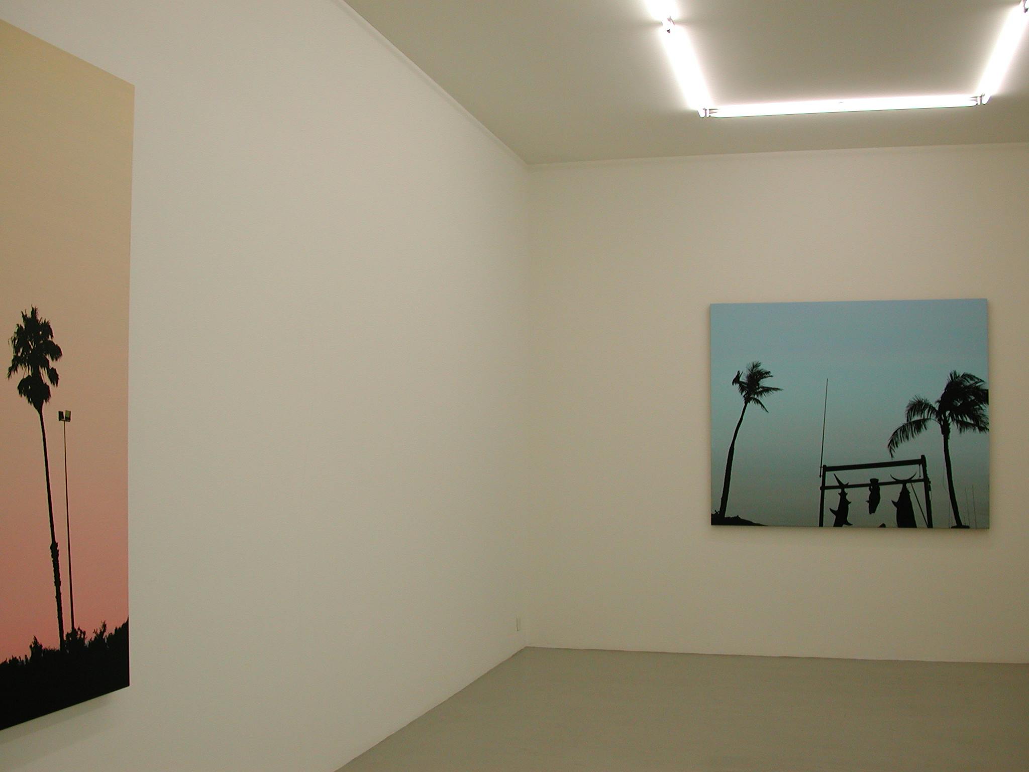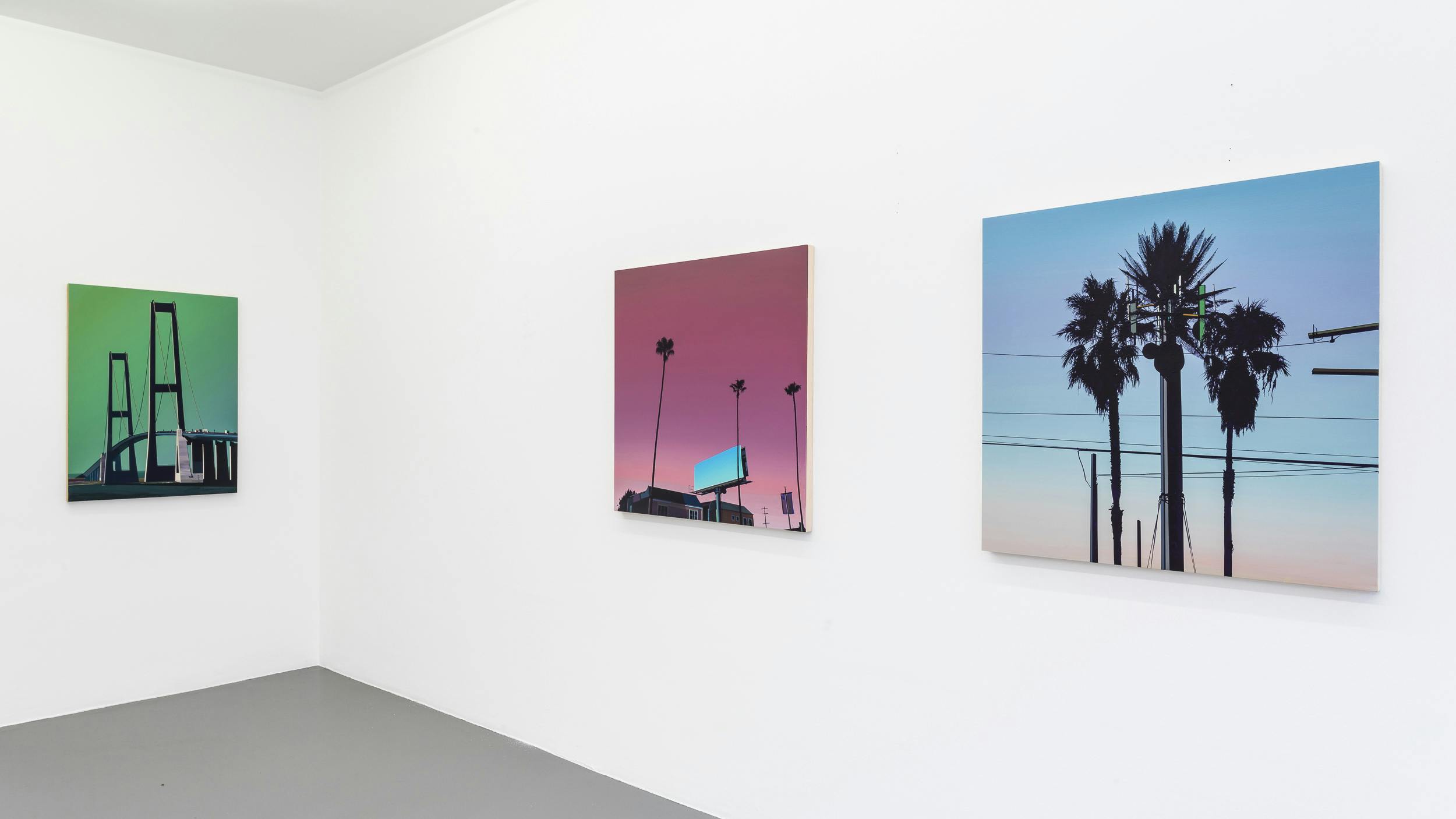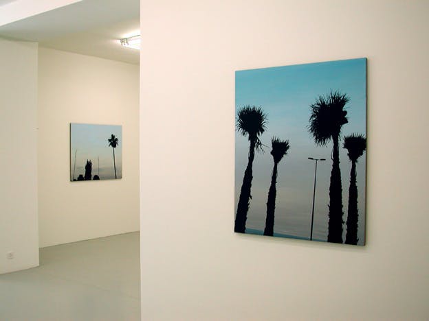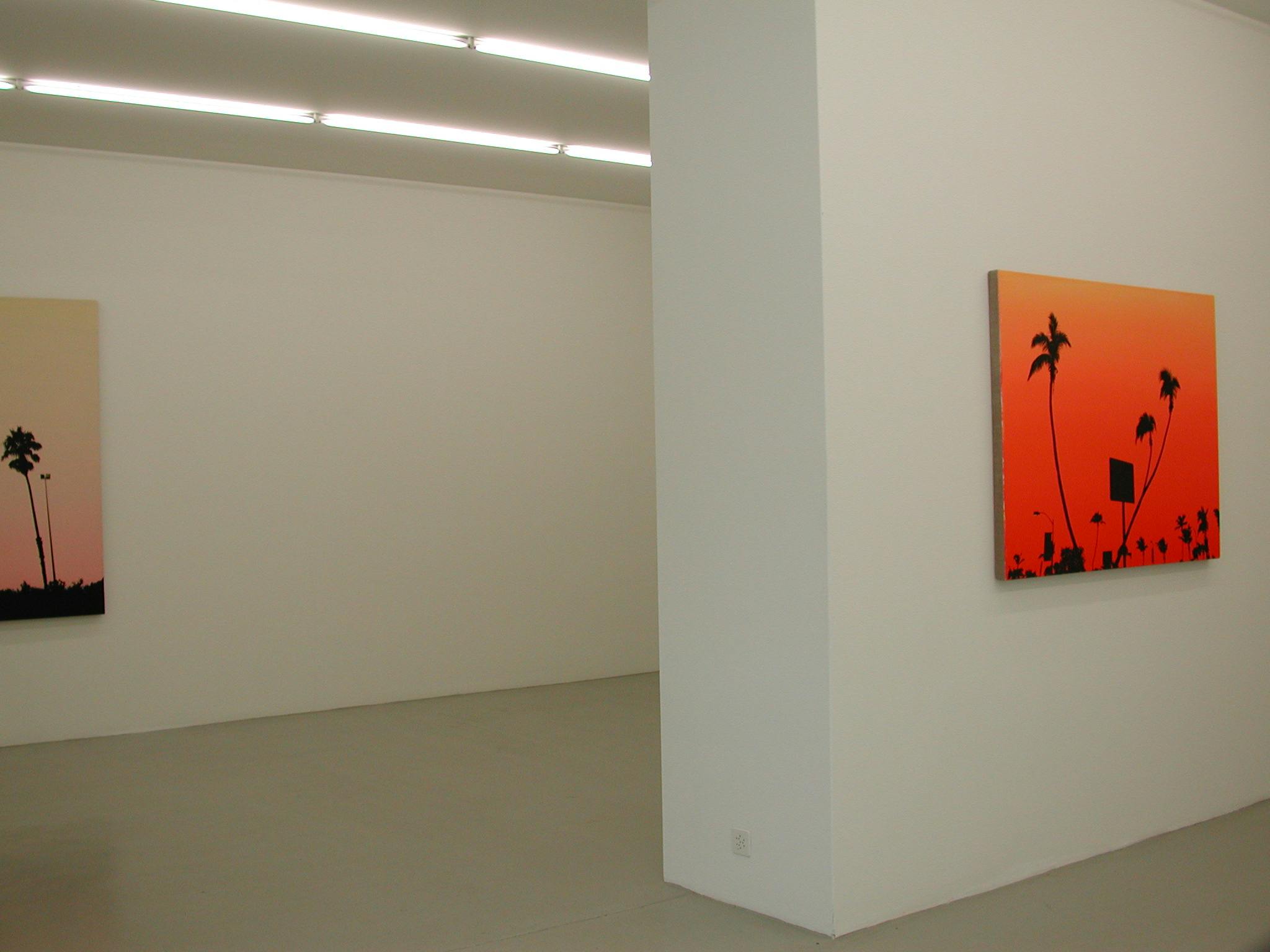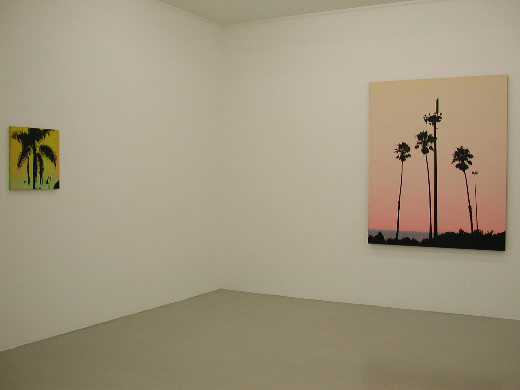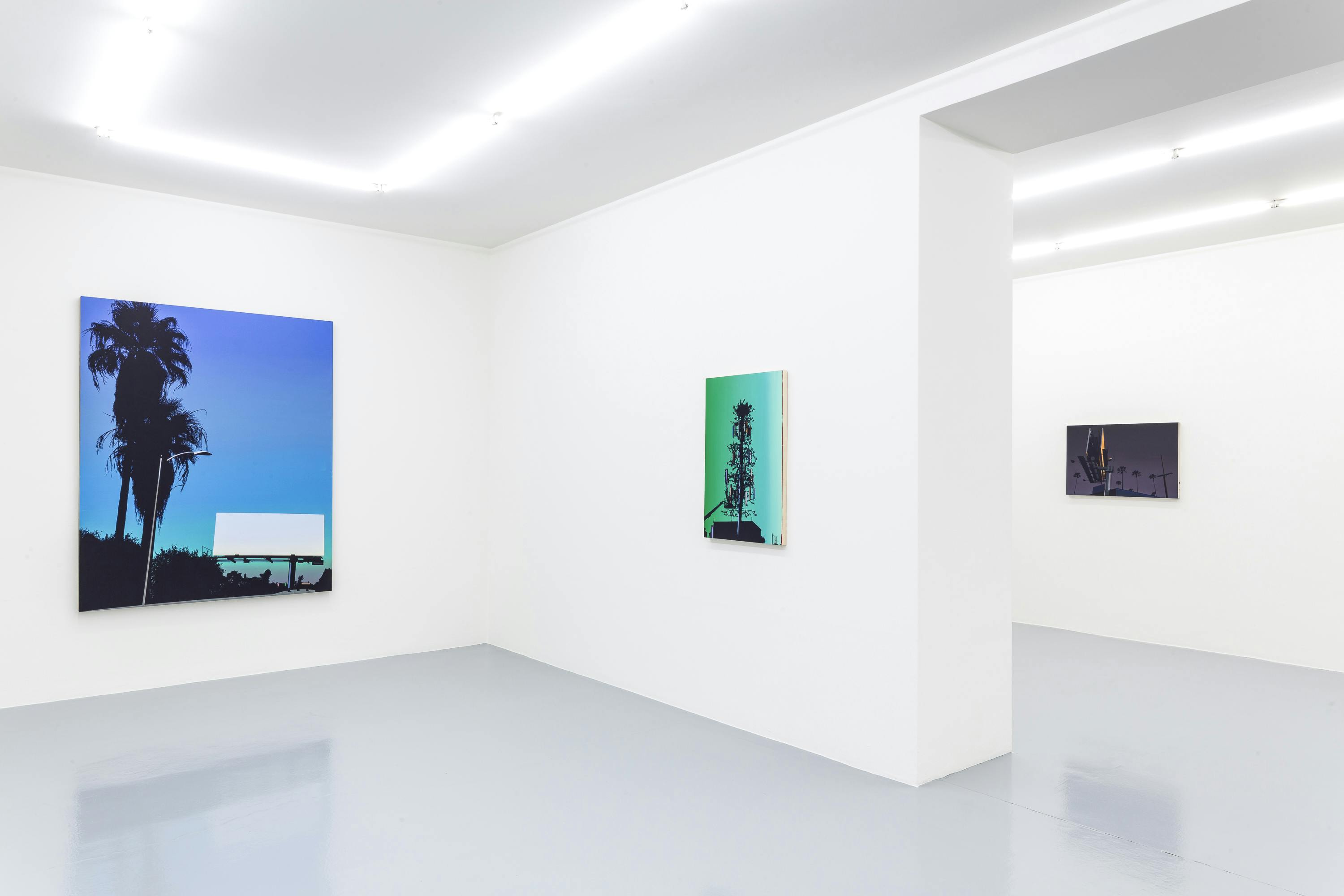 Glen Rubsamen’s craft is painting, which he treats as a traditionally established medium. Yet what appears at first glance to be traditional is at the same time the very source of Rubsamen’s subversiveness. His scenic and artistic views invariably play out against an impressive celestial backdrop that contrasts sharply and spectacularly with the silhouette-like black figures arrayed in the foreground – figures, incidentally, that cannot move; not just because they are painted, but also because they are usually things that are rooted to the spot, such as trees, antennae, and more recently, huge billboards. In spite of their immobility, they are protagonists in the sense that they narrate so much. Their narrative comes from their role serving as representatives of overarching themes. The images appear like film stills, exuding an air of calm and drama. And they all look remarkably Californian – which is still one of the classic projections of the western imagination. —Axel Jablonski