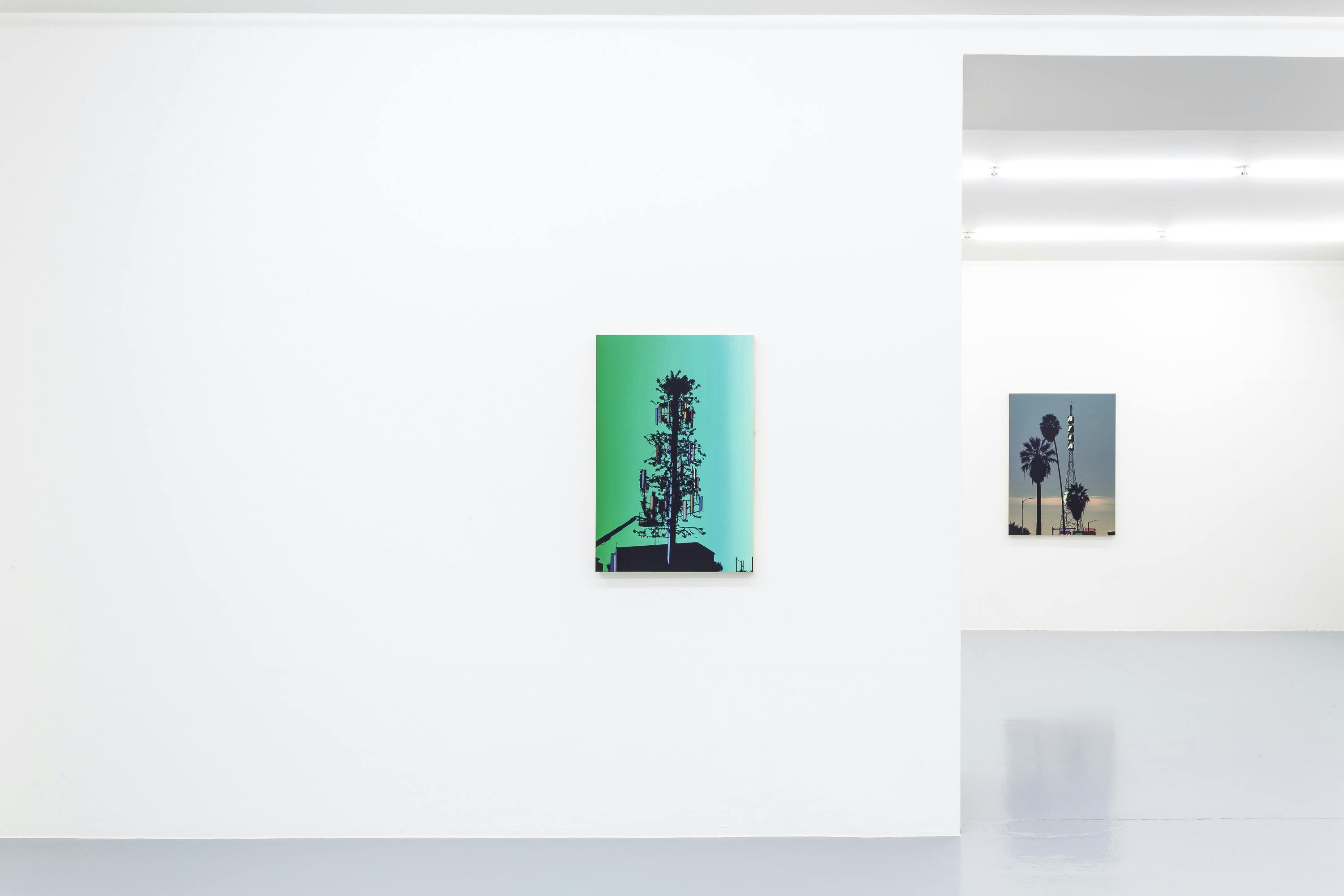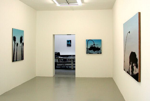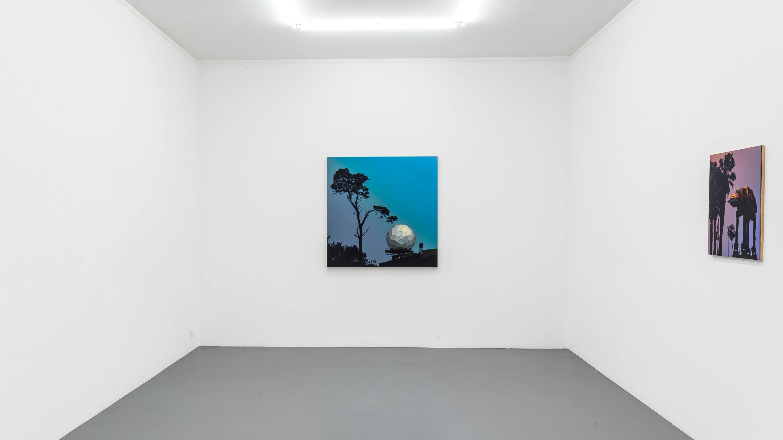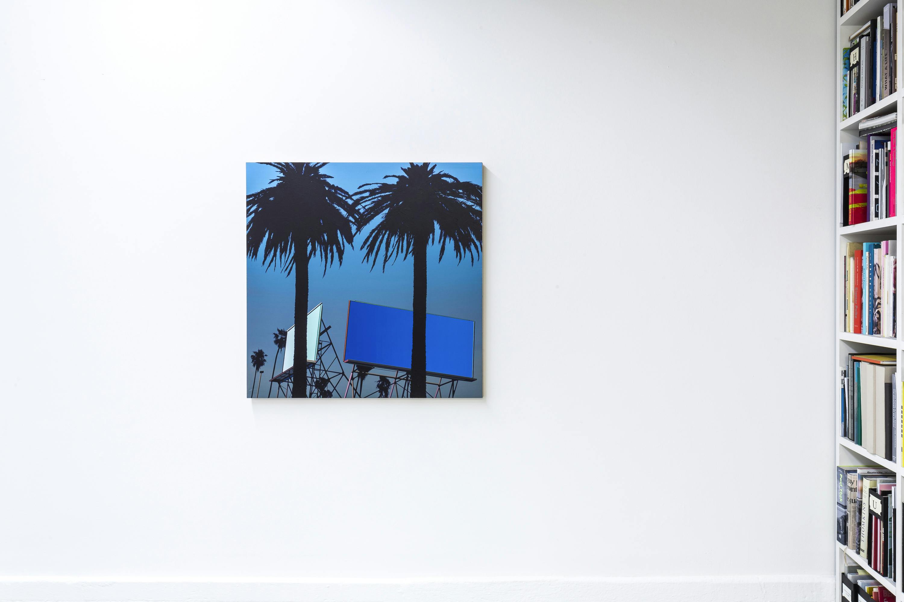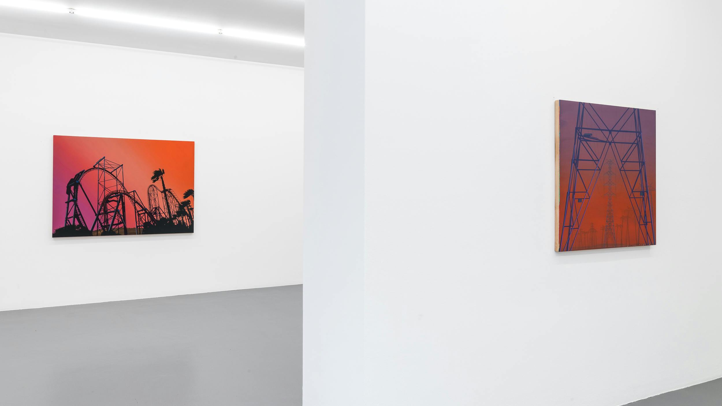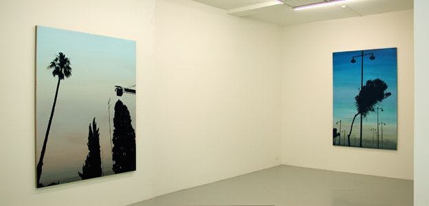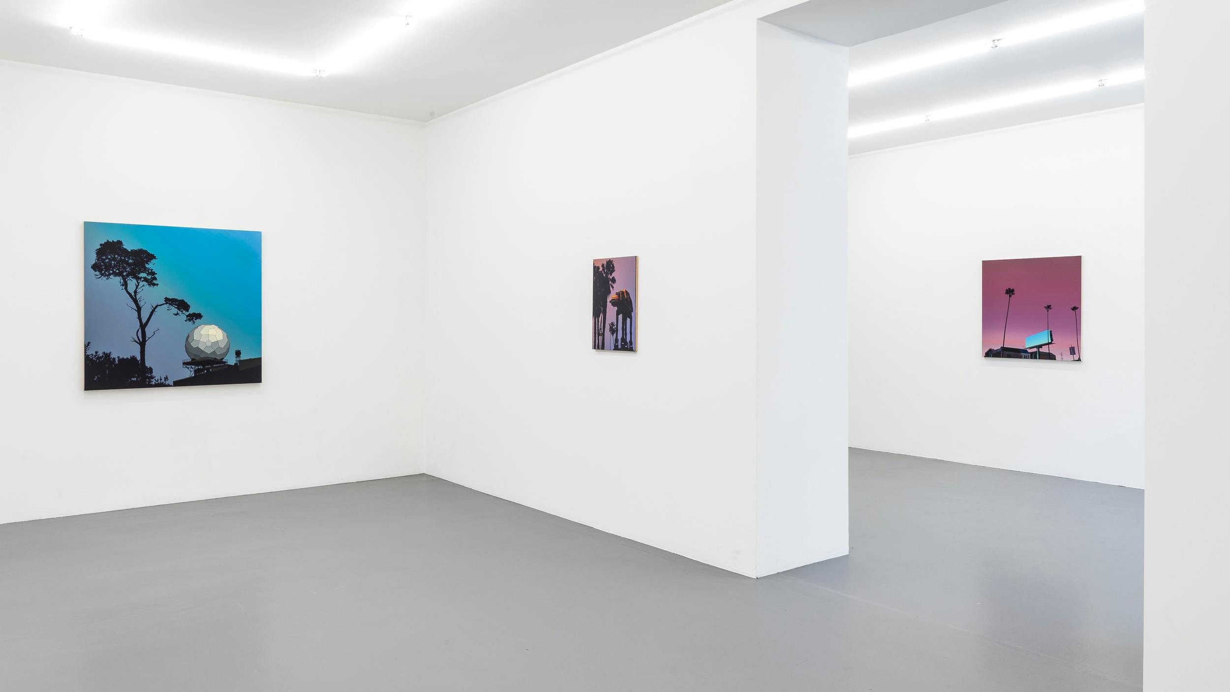 Glen Rubsamen’s craft is painting, which he treats as a traditionally established medium. Yet what appears at first glance to be traditional is at the same time the very source of Rubsamen’s subversiveness. His scenic and artistic views invariably play out against an impressive celestial backdrop that contrasts sharply and spectacularly with the silhouette-like black figures arrayed in the foreground – figures, incidentally, that cannot move; not just because they are painted, but also because they are usually things that are rooted to the spot, such as trees, antennae, and more recently, huge billboards. In spite of their immobility, they are protagonists in the sense that they narrate so much. Their narrative comes from their role serving as representatives of overarching themes. The images appear like film stills, exuding an air of calm and drama. And they all look remarkably Californian – which is still one of the classic projections of the western imagination. —Axel Jablonski