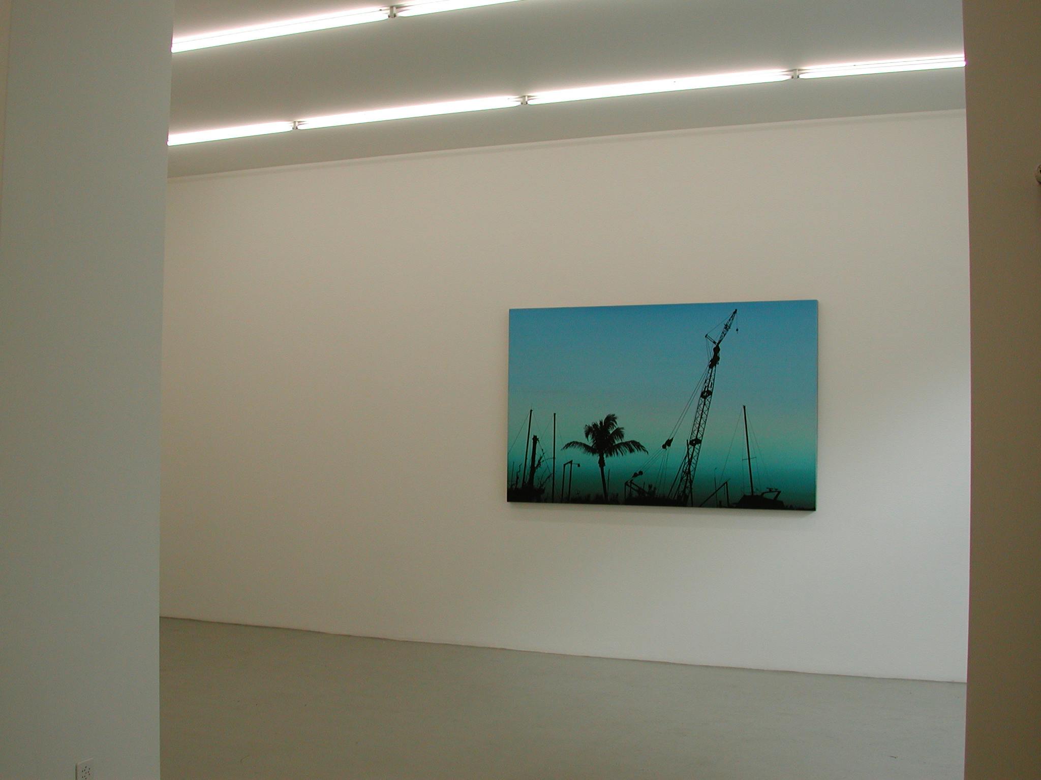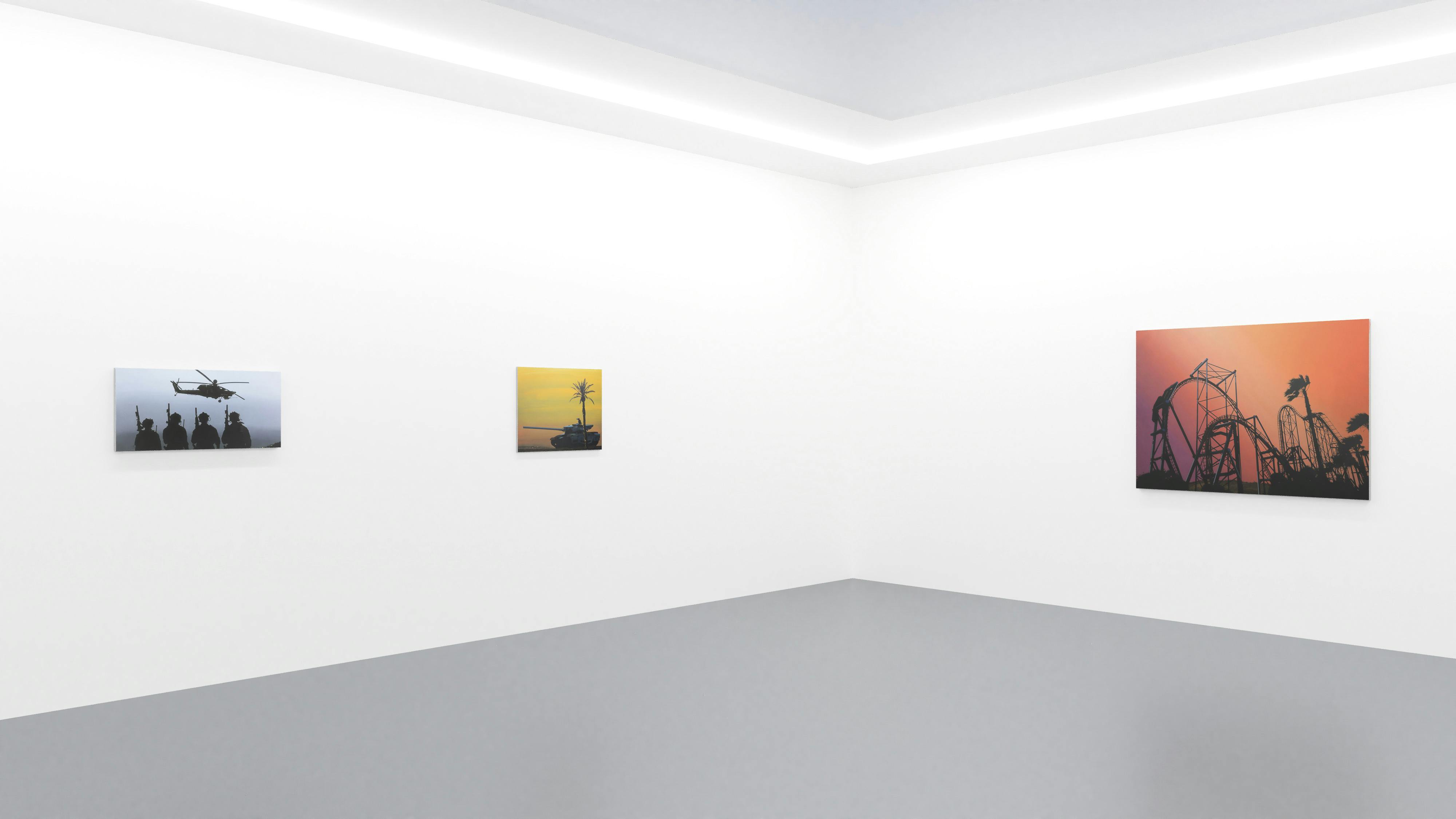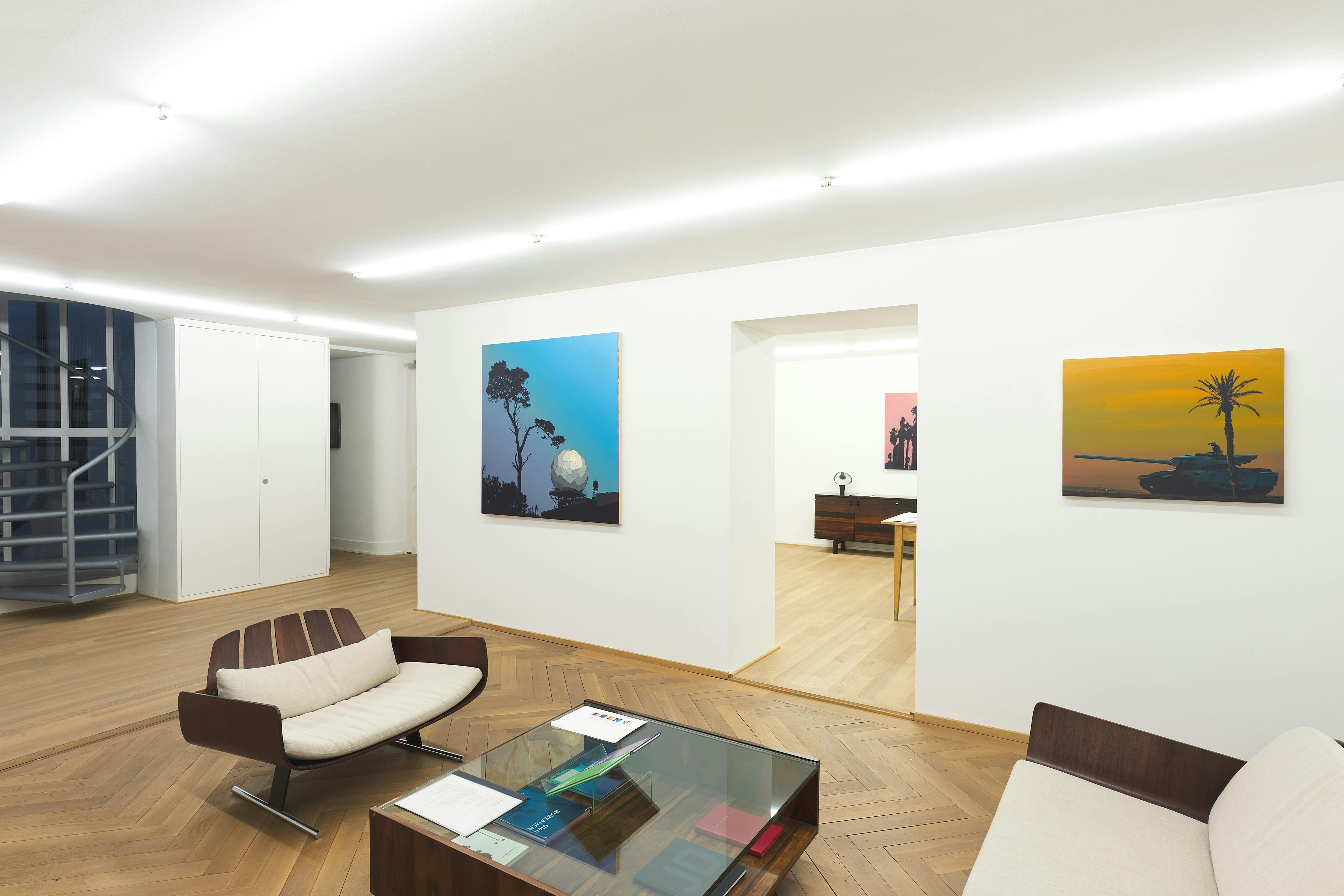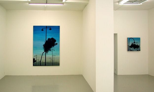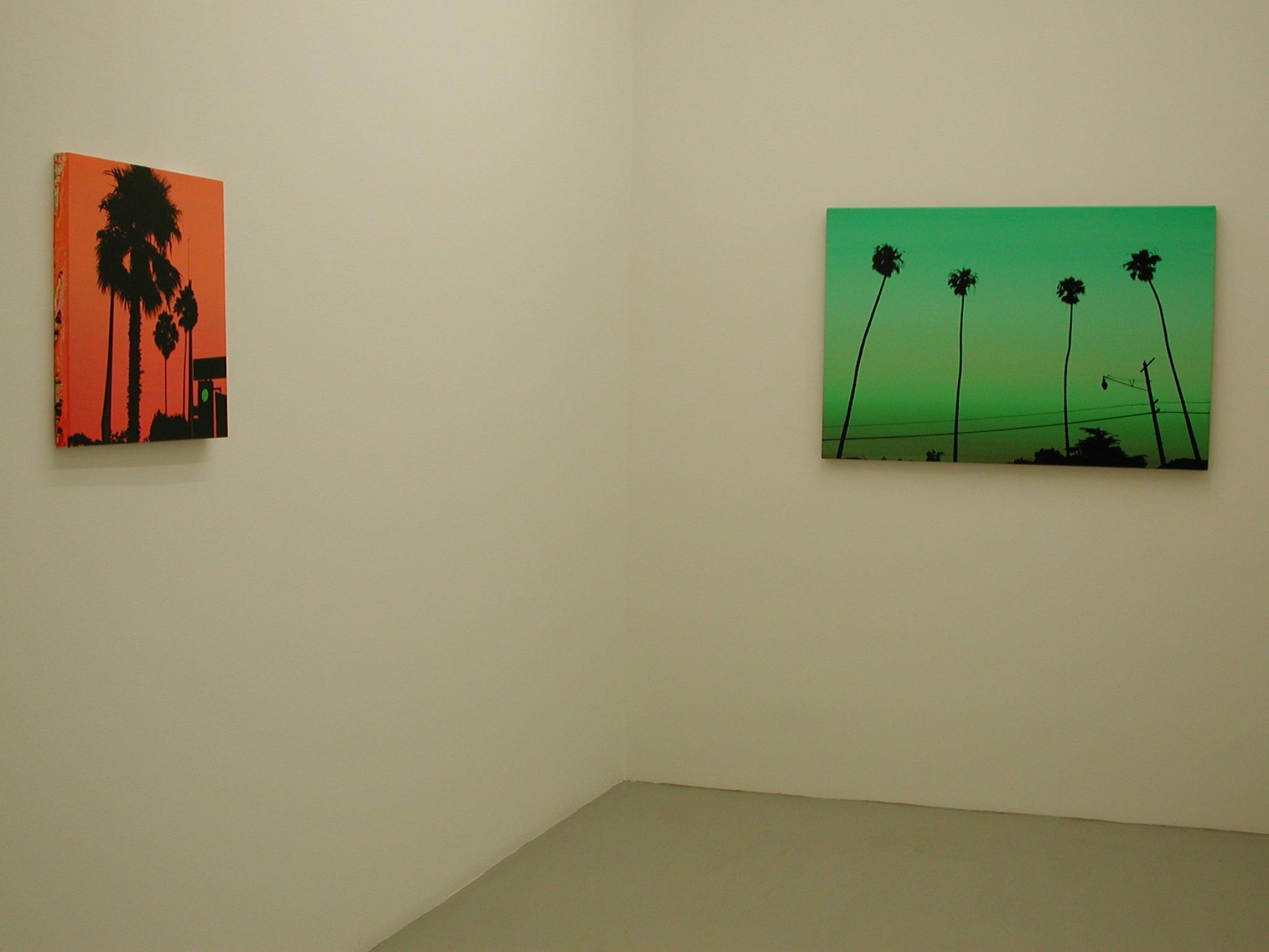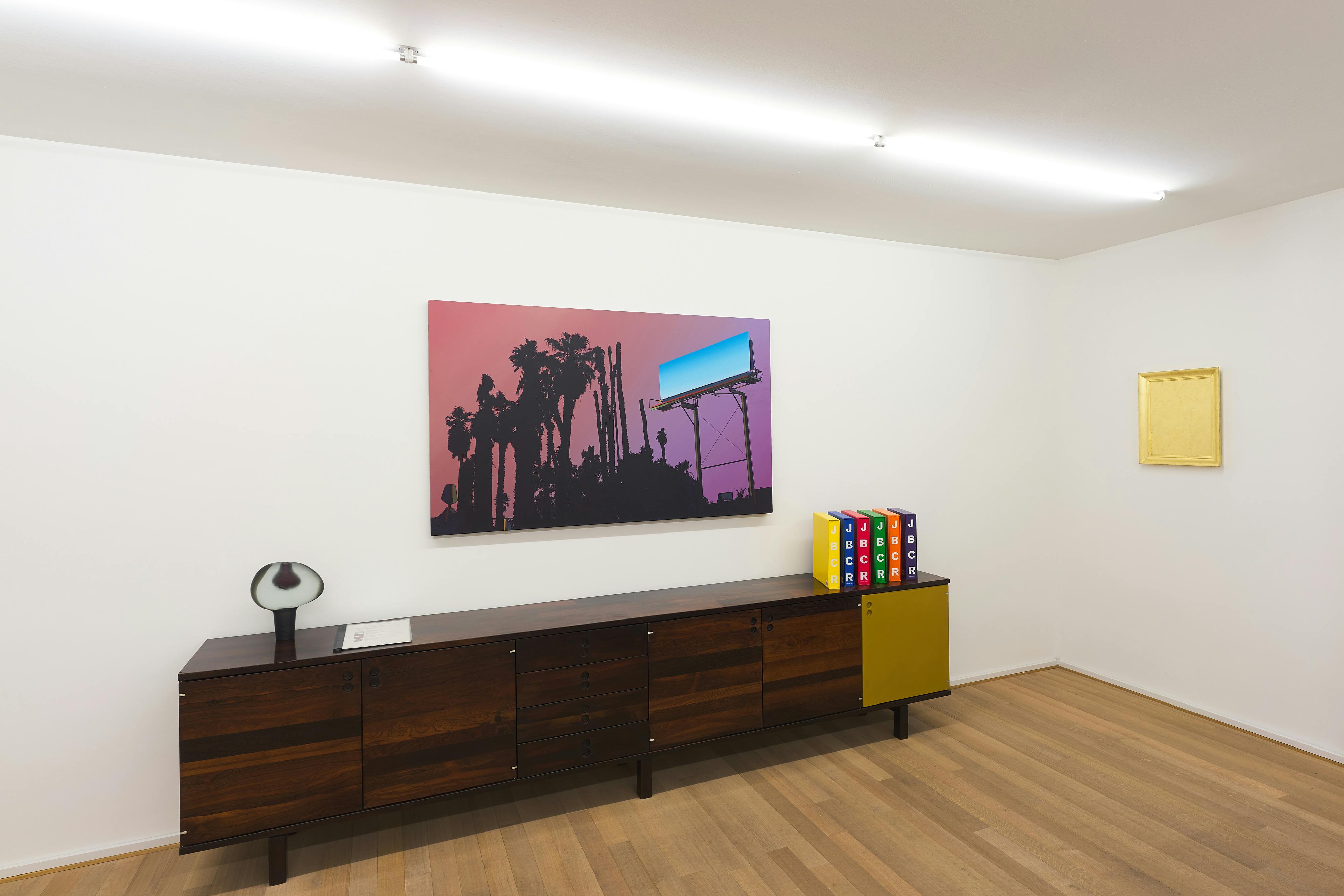 Glen Rubsamen’s craft is painting, which he treats as a traditionally established medium. Yet what appears at first glance to be traditional is at the same time the very source of Rubsamen’s subversiveness. His scenic and artistic views invariably play out against an impressive celestial backdrop that contrasts sharply and spectacularly with the silhouette-like black figures arrayed in the foreground – figures, incidentally, that cannot move; not just because they are painted, but also because they are usually things that are rooted to the spot, such as trees, antennae, and more recently, huge billboards. In spite of their immobility, they are protagonists in the sense that they narrate so much. Their narrative comes from their role serving as representatives of overarching themes. The images appear like film stills, exuding an air of calm and drama. And they all look remarkably Californian – which is still one of the classic projections of the western imagination. —Axel Jablonski