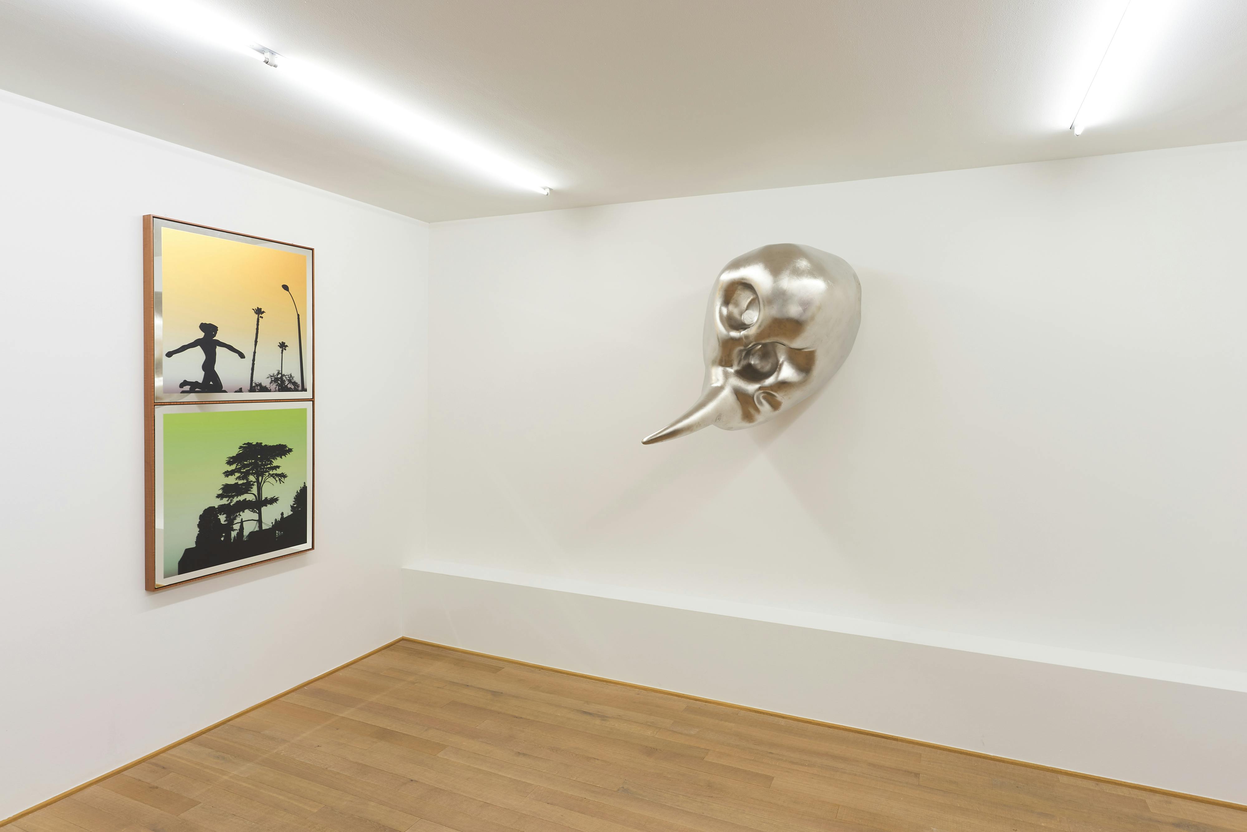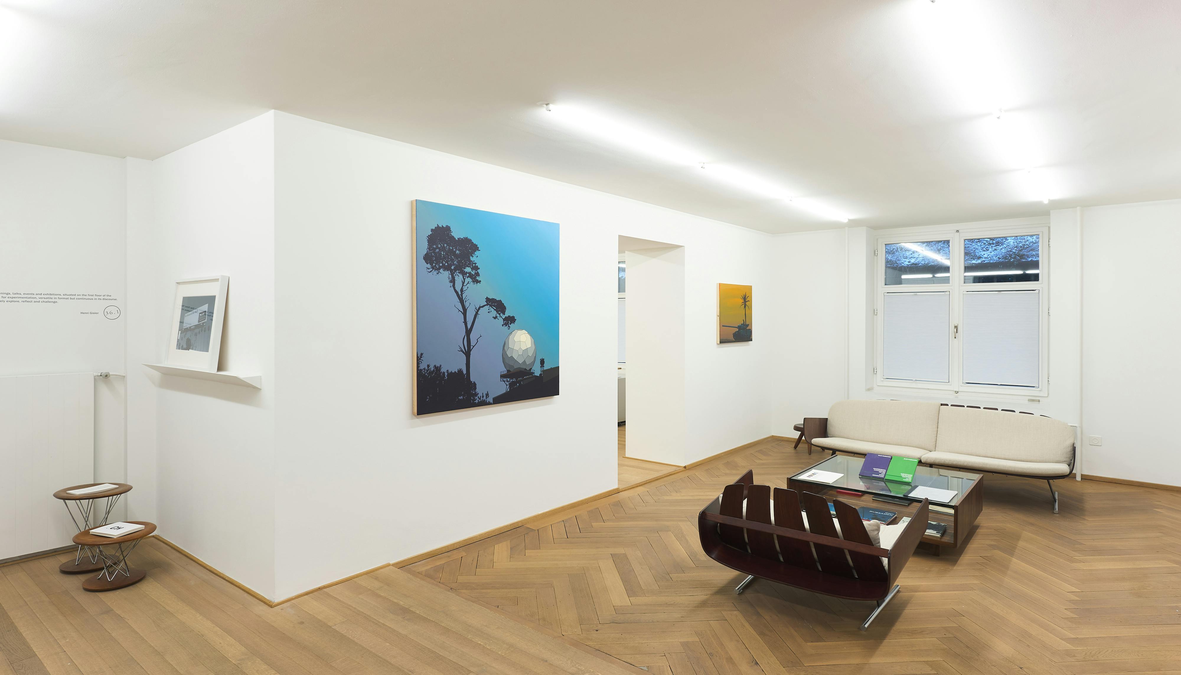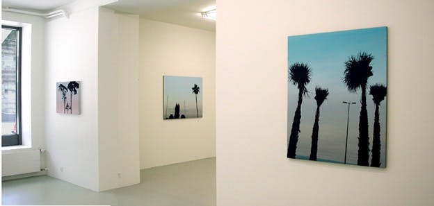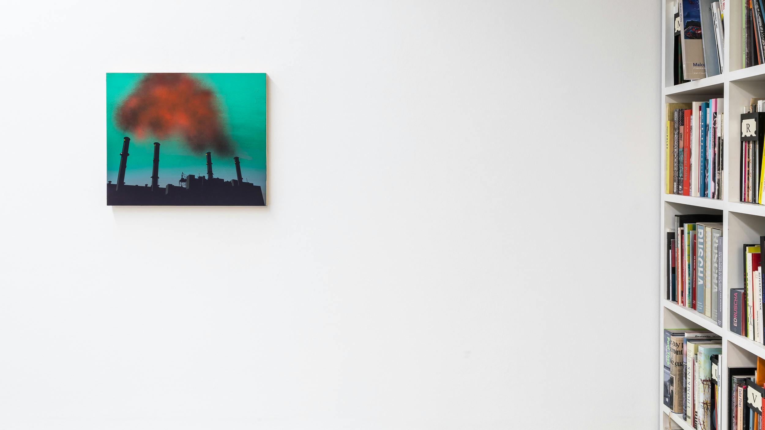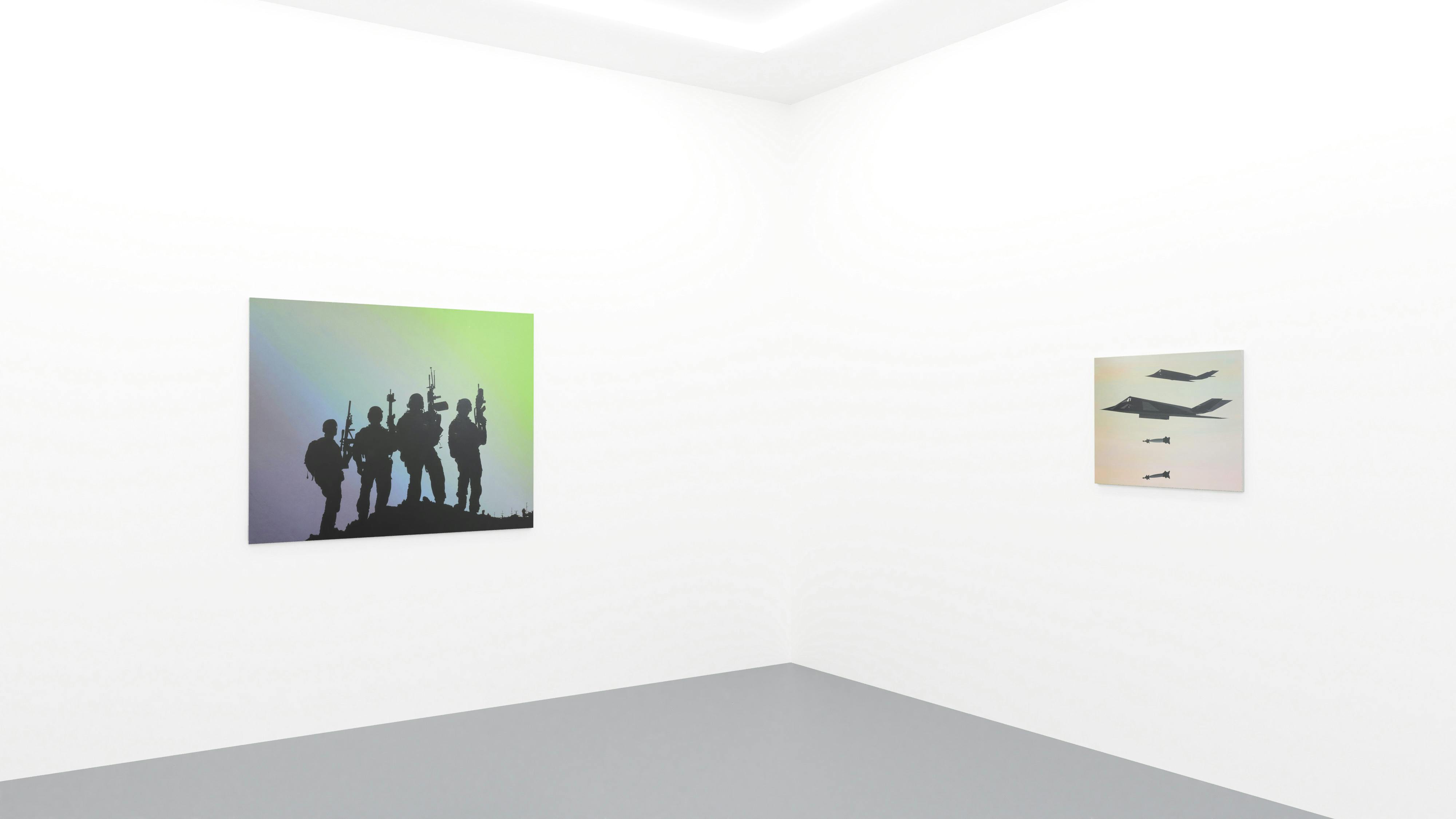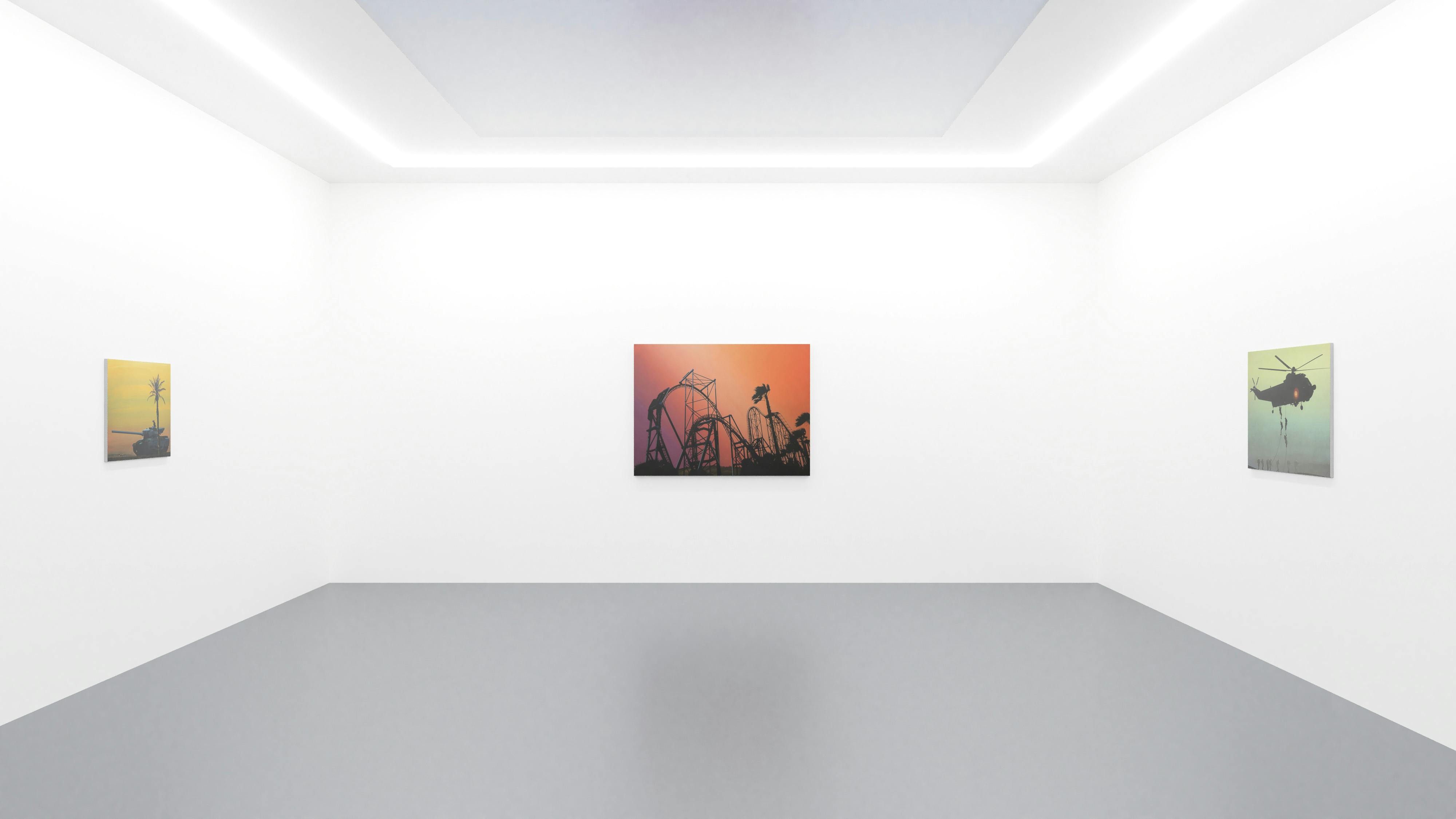Glen Rubsamen’s craft is painting, which he treats as a traditionally established medium. Yet what appears at first glance to be traditional is at the same time the very source of Rubsamen’s subversiveness. His scenic and artistic views invariably play out against an impressive celestial backdrop that contrasts sharply and spectacularly with the silhouette-like black figures arrayed in the foreground – figures, incidentally, that cannot move; not just because they are painted, but also because they are usually things that are rooted to the spot, such as trees, antennae, and more recently, huge billboards. In spite of their immobility, they are protagonists in the sense that they narrate so much. Their narrative comes from their role serving as representatives of overarching themes. The images appear like film stills, exuding an air of calm and drama. And they all look remarkably Californian – which is still one of the classic projections of the western imagination. —Axel Jablonski