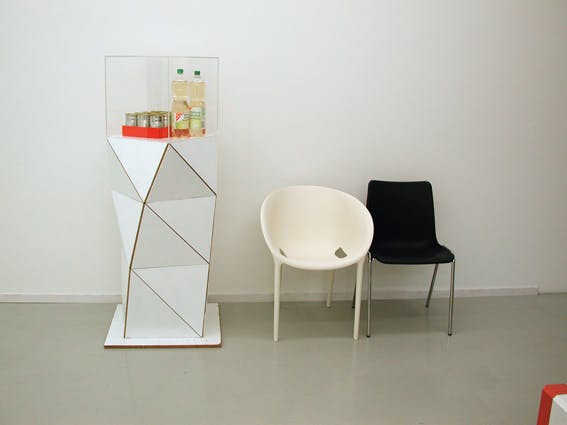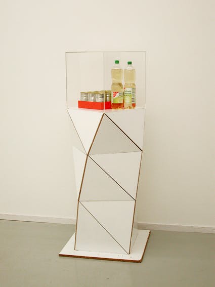 He makes modular, sometimes serial works of a modernist cast and often turns his sculptures into displays of found pieces. The works seem to have a function – almost – but it eludes a definition. Often he adds another layer of meaning to his sculptures by applying copies of pages from books and newspaper. He devotes himself with a passion to the mundane artefacts of daily life and the experiences to which he alludes are dominated by standardization, as symbolized in the recurring use of containers and tin cans. —Axel Jablonski