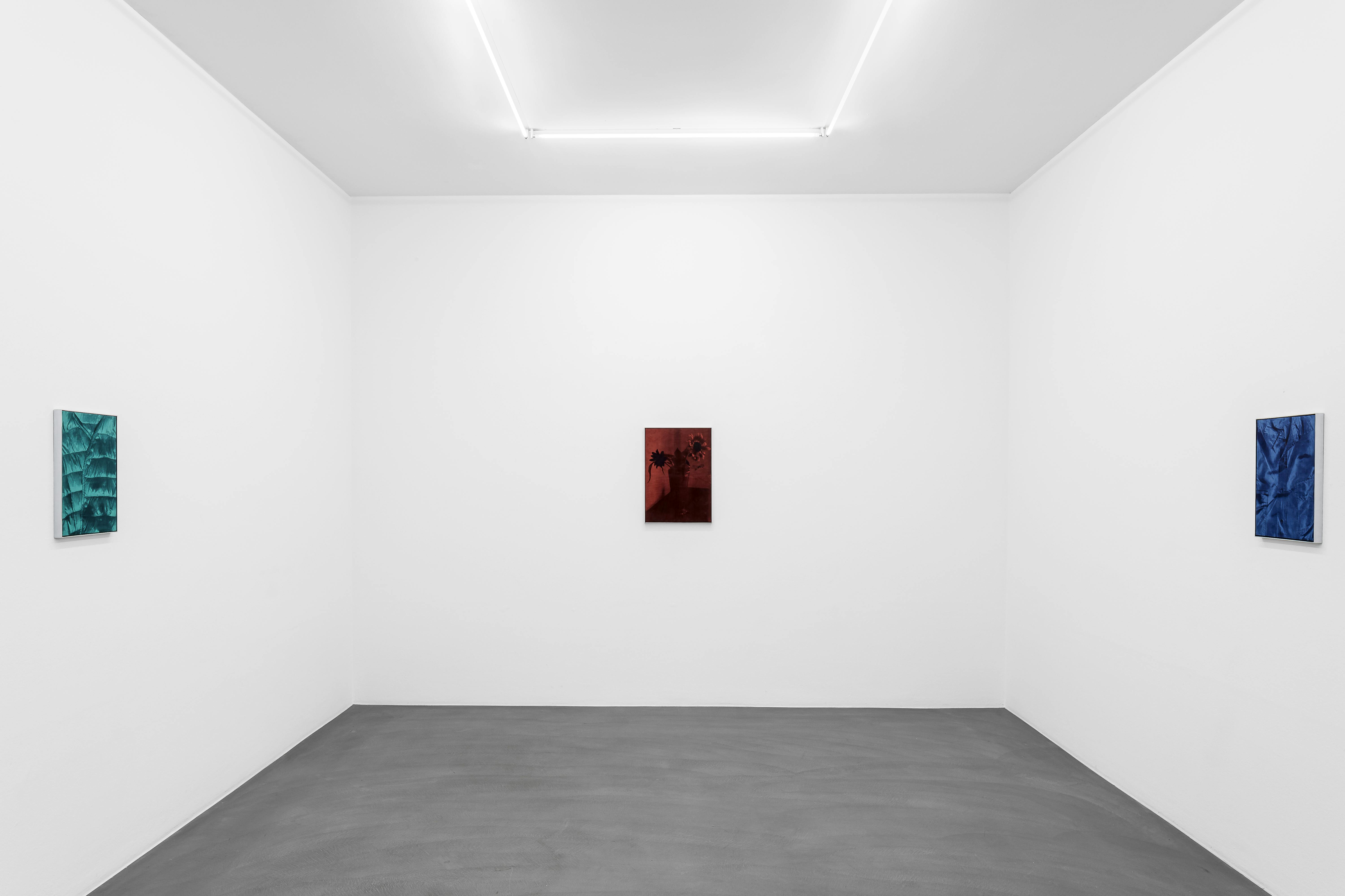 Poppy Jones works offer a set of personal fragments, an abbreviated autofictional record of the culture at large. Her process is led by intuition and the paintings emerge from the artist soaking up impressions of the things that surround her and photographing them. Their photographic origin lends them a poignancy – they capture a time of day, the angle of a shadow, dust motes in a ray of light. A windowsill, an open book, a zipped jacket, a lit candle, flowers drooping in a vase. Her works present a kind of incomplete inventory, a partial view, or a portrait of someone just out of shot. Jones works on silk, suede or cotton, in canvases sometimes cut from her own garments or items she has sourced online. These materials are often true to the images themselves as well as being connected to her life.