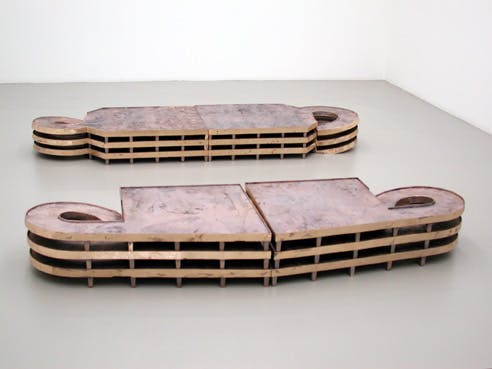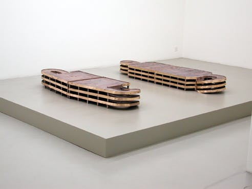 Rita McBride’s work explores the production of public space and the reception of culture through sculptures that recreate familiar elements from our immediate environment. McBride sometimes dramatizes objects related to architecture and design, often through the use of unusual materials and unexpected dimensions. As such, she examines acquired notions of form, function, and material in relation to a vocabulary that challenges the myths of progress induced by modern ideology.