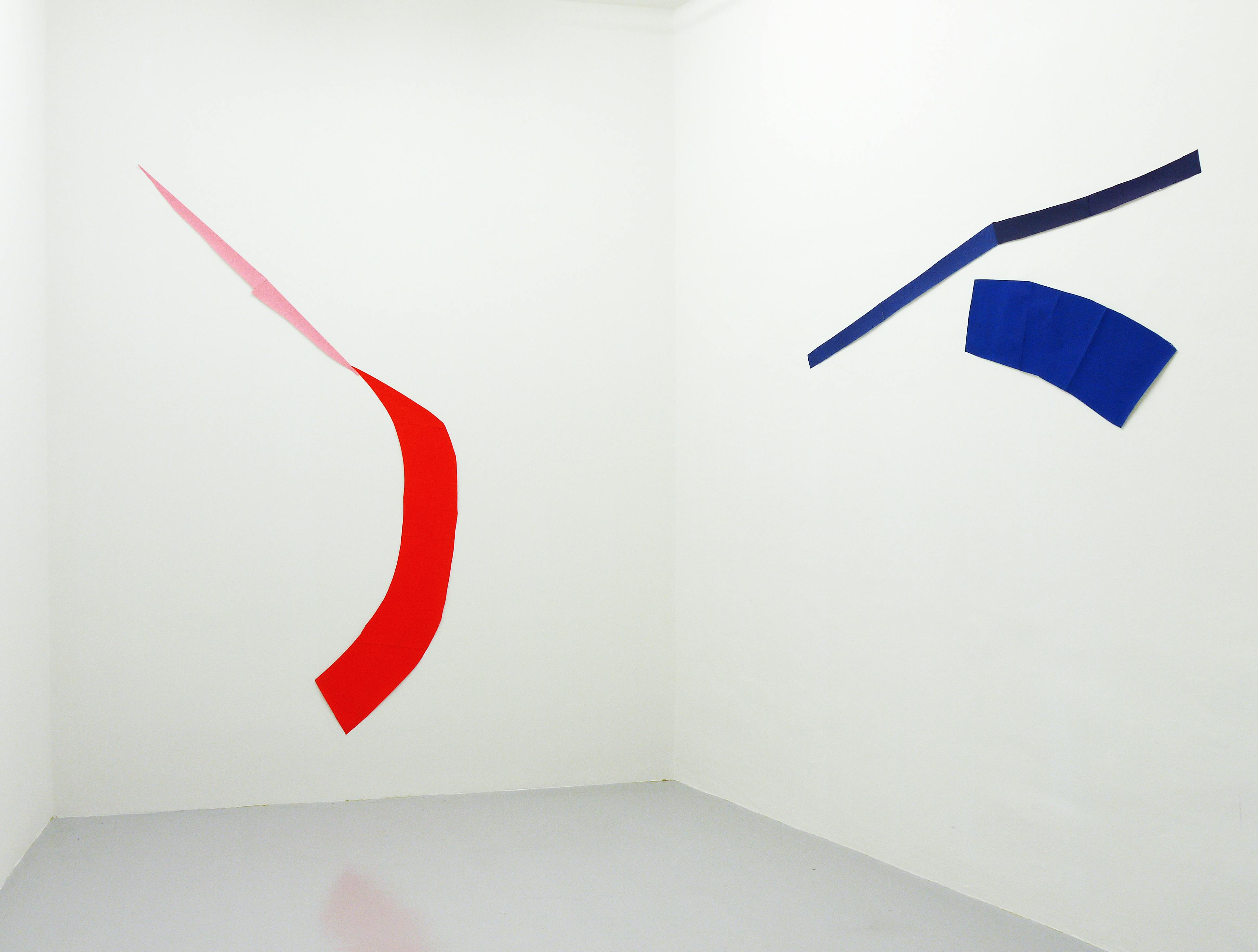 The works of Guy Mees (in Antwerp, 1935-2003) are also related to silhouettes: colourful strips of paper arranged in lines and stapled to the bare wall. Although they are heavily reduced and structured two-dimensionally, through the various green and blue tones they in some way evoke light and shadow. They thus acquire a spatial dimension. Guy Mees entitled this series Verloren Ruimte or "lost space". In actual fact it concerns two very different groups of work that examine the theme of "lost space" in modern art. The works in the first group were made between 1960 and 1967 and those in the second between the middle of the '80s and the early '90s. The works made in the '60s consist of lace fabric and frequently of pink, blue or white neon light as well, all materials that suggest a sensuous, erotically charged world full of romantic moments. In contrast the later wall works communicate access to another imaginary space and are therefore comparable to classical paintings. At the same time they can be interpreted as neutral works that draw attention exclusively to themselves.