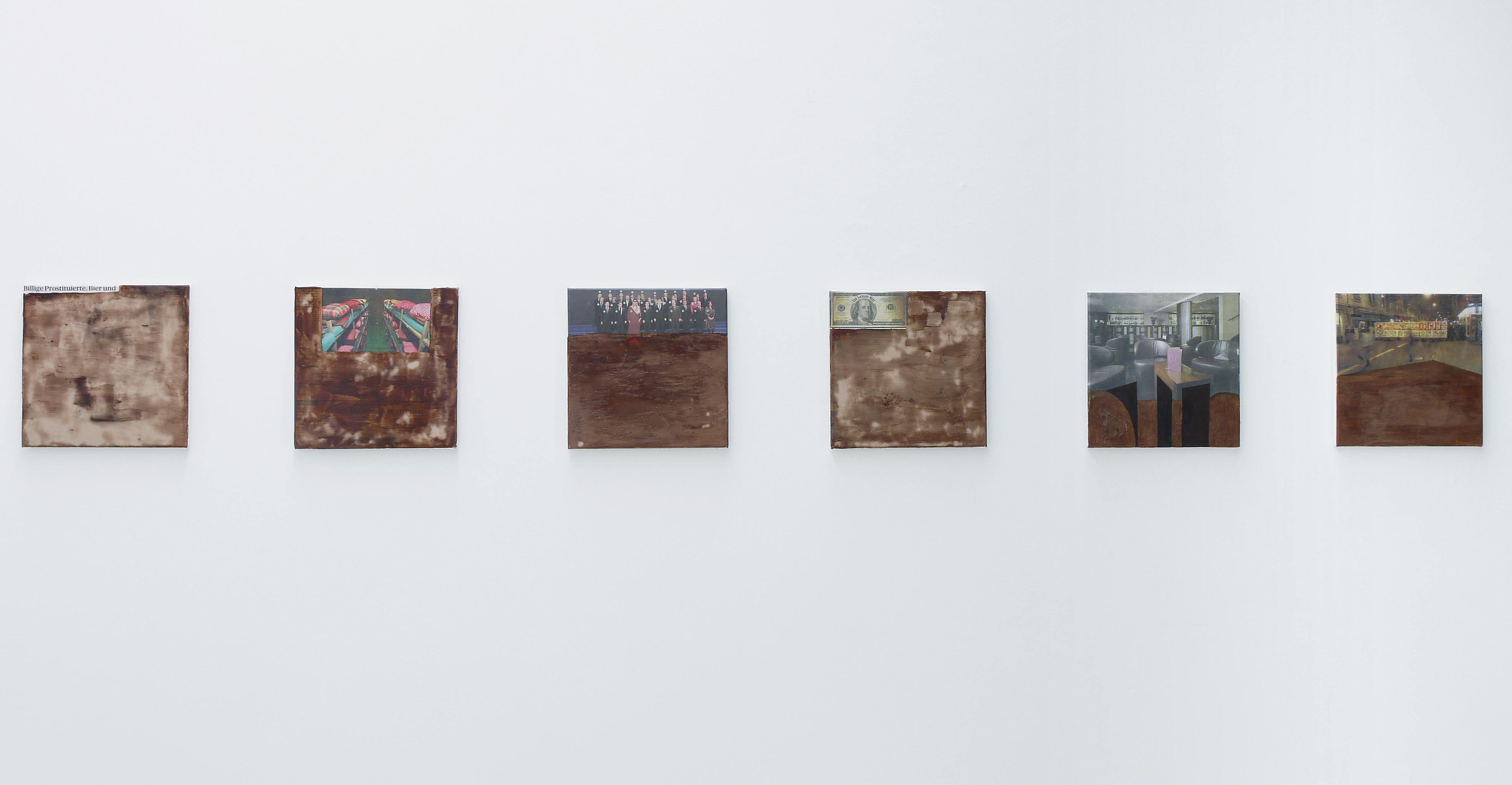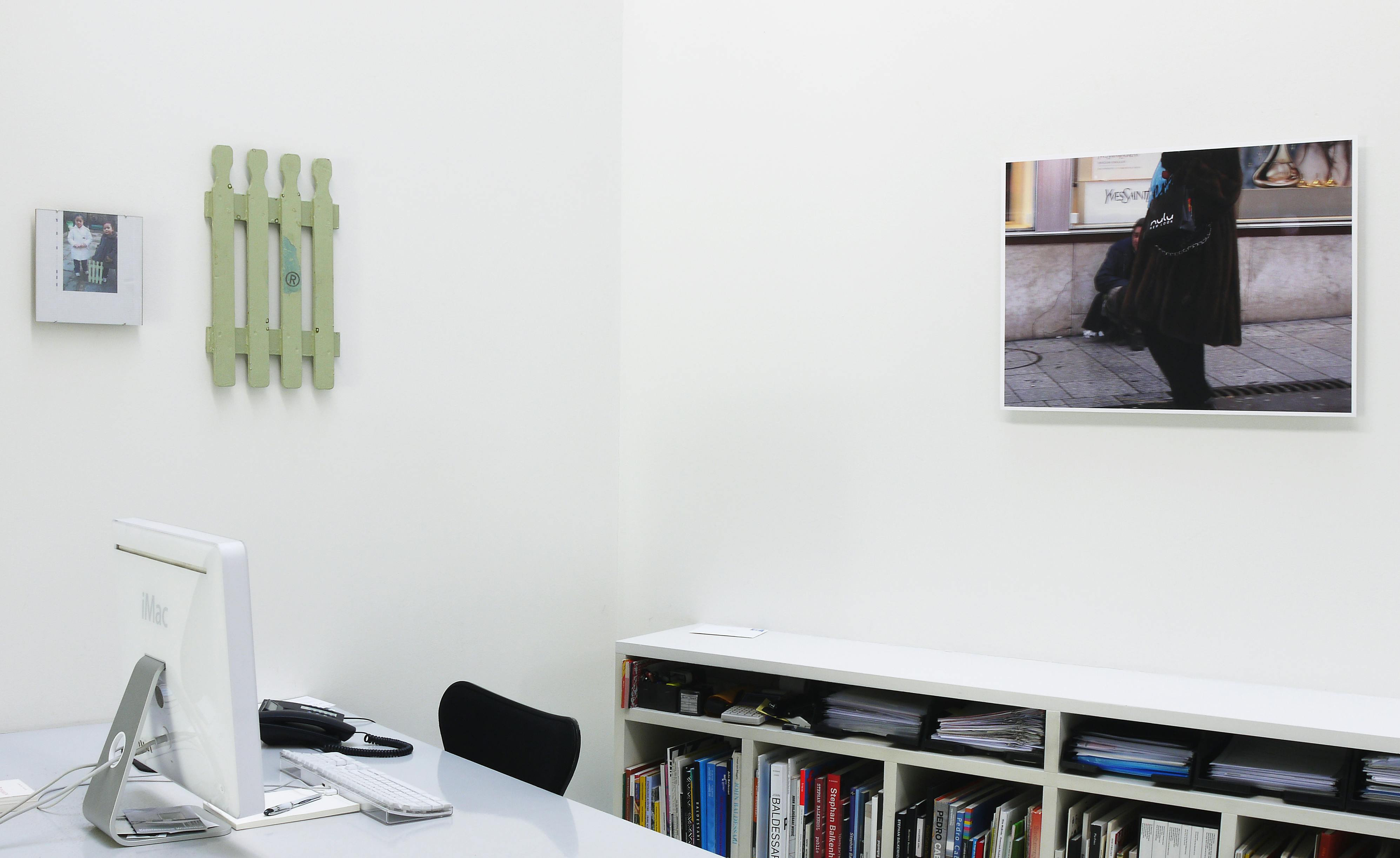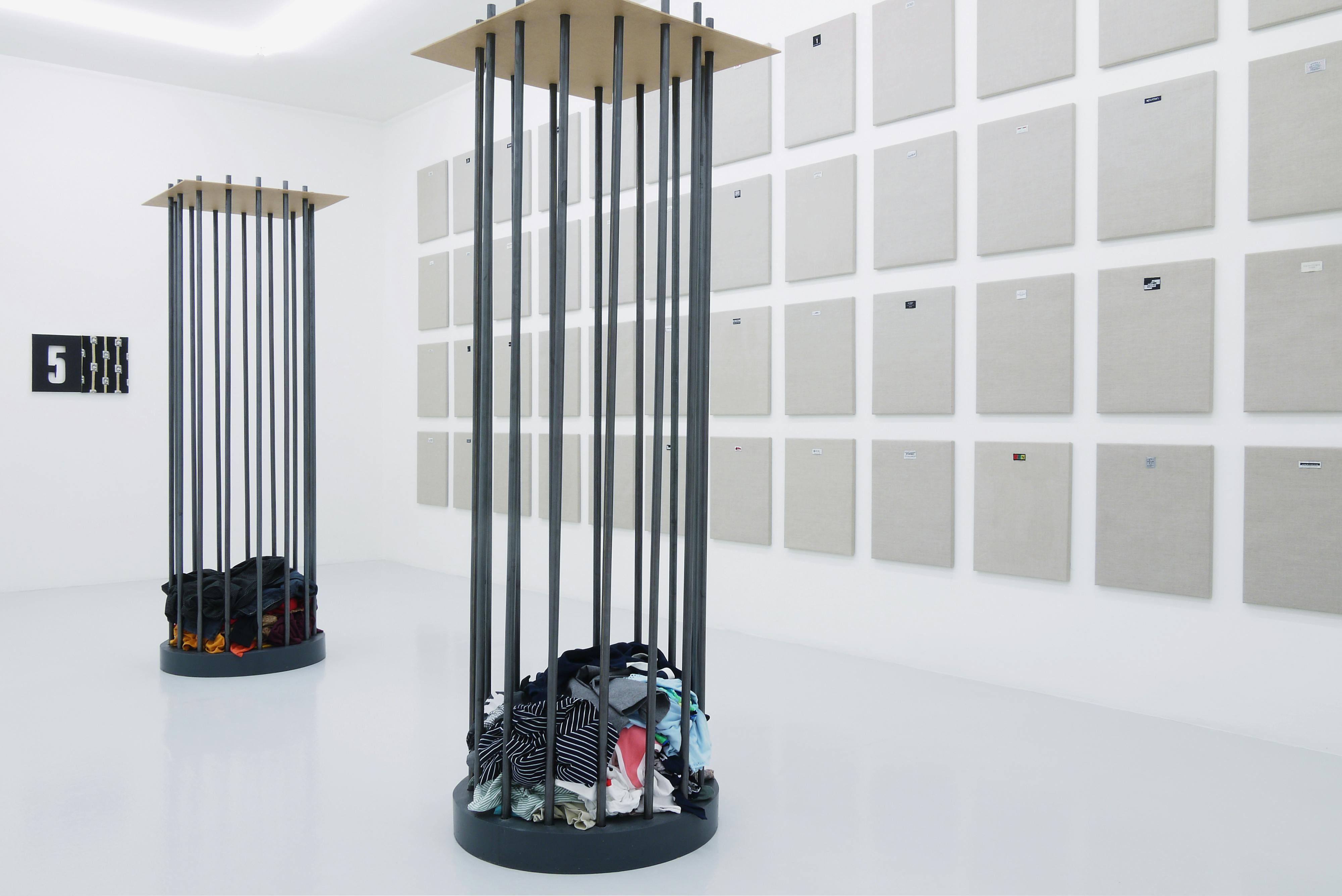 The letter R appears almost like a leitmotif in Anüll’s oeuvre: as the symbol that designates a registered trademark, it stands for a consumer world governed by marketing. For instance, he placed the trade- mark ® on the base of a sculpture – a used, green designer chair issued by a Dutch studio in the 60s and early 70s – therefore making it not visible. In contrast, fashion labels sewed onto 56 canvases make an outspoken and conspicuous appearance. Measuring 40 x 50 cm, they are the approximate size of a man‘s chest. The artist had removed well-known and lesser-known fashion labels from men‘s and women‘s clothing and instead of discarding the clothing, he imprisoned it in two round cages with iron bars two metres high, standing on concrete bases. Another similarly witty and allusive installation con- sists of two old, extremely dilapidated highchairs on the backs of which he has inscribed the words «not art» and «copy» in Cyrillic lettering. Not only does this piece unmistakably reference Walter Benjamin’s discourse on the technical reproducibility of the work of art, it also demonstrates the artist’s penchant for upsetting our value system by turning garbage into a work of art, thereby revaluating and upgrading it. Toxic securities as waste products are the subject matter of L’odeur et l’argent. A whiskey glass filled with perfume is placed next to a decanter stuffed full of bank notes cut into snippets. The associative potential is almost unlimited, ranging from Jeremias Gotthelf’s novel Geld und Geist (Money and Mind) to Sigmund Freud’s psychoanalytical analogies involving money, power and excrement.