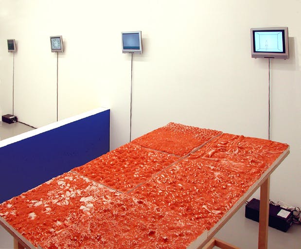 Von grundlegendem Interesse für den Künstler waren dabei von Beginn an Phänomene der Projektion und die sich hierdurch erschließende Möglichkeit eine eigene imaginäre Welt zu erzeugen. Die Problematik der Grenzüberschreitung wurde damit zu einem wichtigen Moment in seinem Schaffen. In den siebziger Jahren thematisierte Mullican sie in verschiedenen Performances als „Ins-Bild-Gehen“ und später auch in den Performances unter Hypnose. Die hiermit implizit angesprochene Frage nach dem Status und der Geltung der so geschaffenen imaginären Welten stellt sich aber in allen Werken Mullicans, zumal der Künstler die Subjektivität der Welterzeugung und -aneignung immer wieder betont und auch den totalitären Aspekt dieser Wirklichkeitskonstrukte sichtbar macht. Die Computer generierten Stadtbilder, die auf den allegorischen „Charts“ des Künstlers aufbauen, und seine großformatigen „flags“ zeigen dies besonders deutlich. Durch die situative Einbindung der „flags“ in unterschiedliche Kontexte entwickeln sie auf Grund ihrer piktoralen Prägnanz und extremen Formalisierung bei gleichzeitiger „Bedeutungslosigkeit“ aber auch ein reflexives Moment, dem kritische Brisanz eignet. Dieses subversive Potential kommt auch in den neuesten Werken Mullicans zur Geltung, kurzen zeichentrickfilmartigen Computeranimationen, die der Künstler „Animations“ nennt. Sie zeigen ähnlich wie die Zeichnungsserien der 70iger Jahre Fragmente einer imaginären Welt. Die Stilisierung und Flachheit der Darstellung dieser „Details“ tragen zur emblematischen Wirkung der Animationen bei, der ihnen einen archetypischen Charakter verleiht. Gleichzeitig jedoch bewegen sich diese auf Grund ihrer extremen Simplizität an der Grenze zur Banalität. So erscheinen die Animationen „smoke“, „clock“, „death“, „shadow I and II“ oder auch „boiling pot“ in einer fruchtbaren Spannung von Banalität und Symbolhaftigkeit. Sie bilden eine Antithese zu den ebenfalls in der Ausstellung erstmals gezeigten neuen „Stills“, die gleichsam in der Totalen Überblick über weite künstliche Landschaften bieten. Zwar setzen diese grenzenlos weiten Landschaften dem