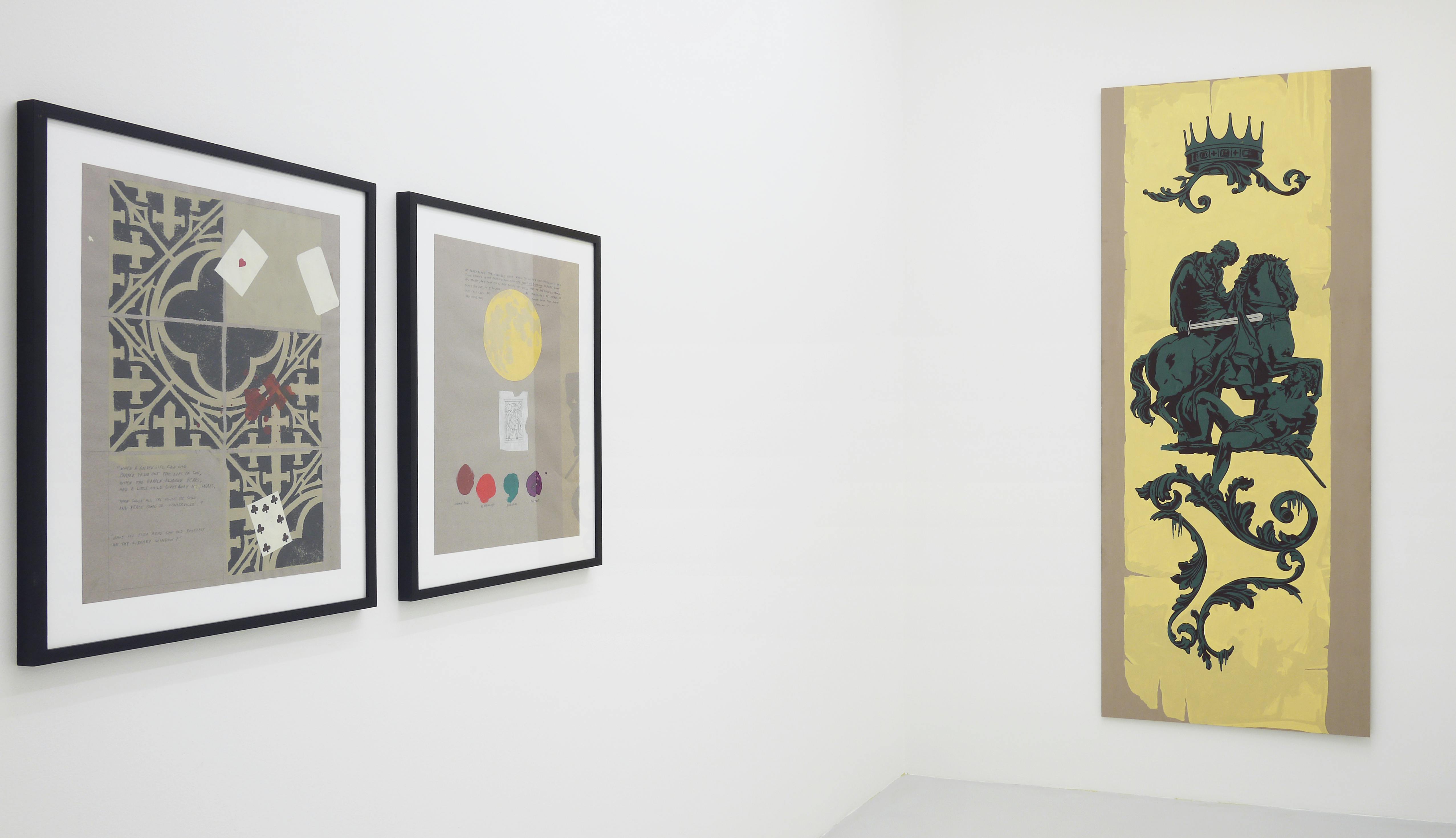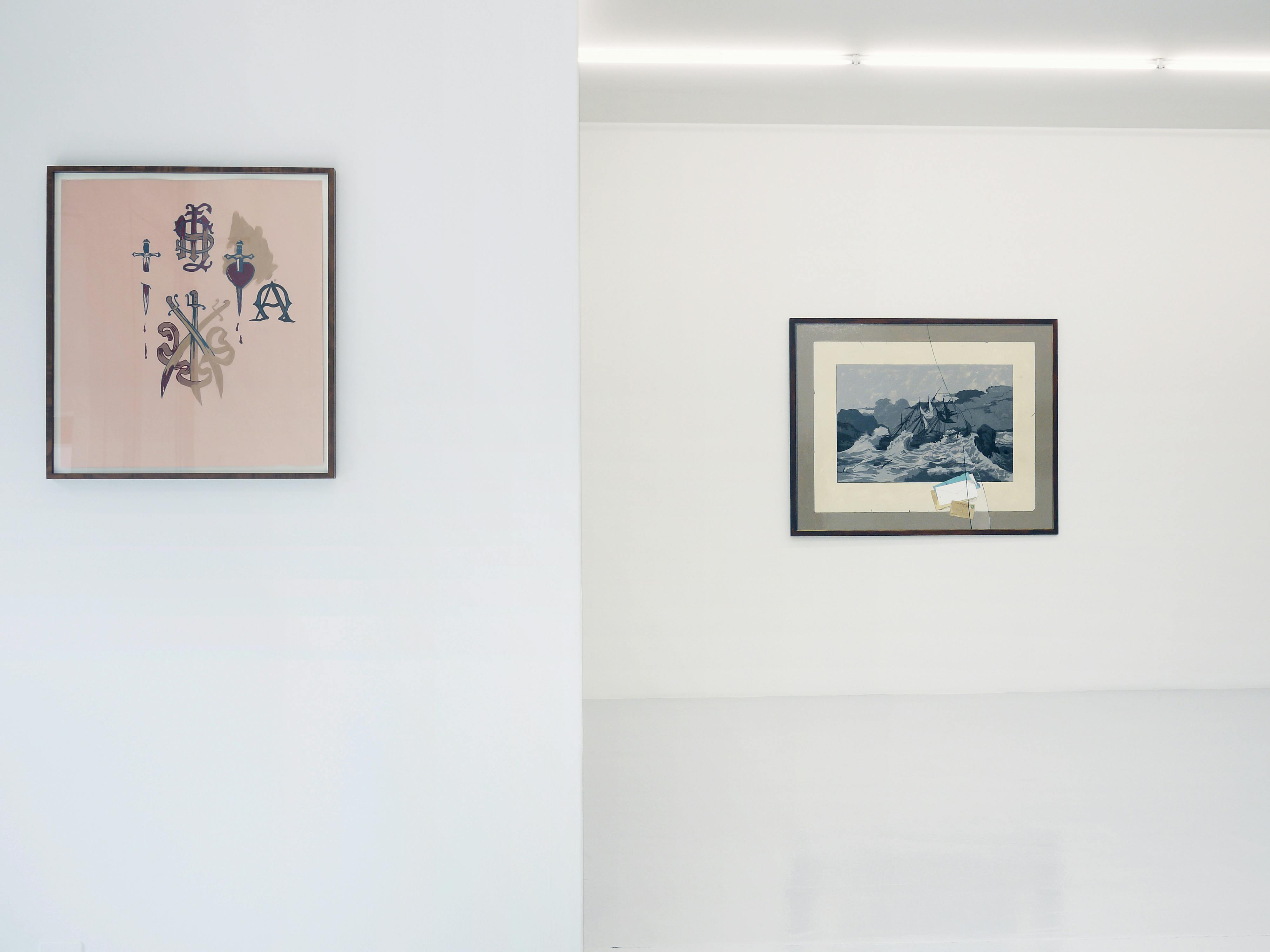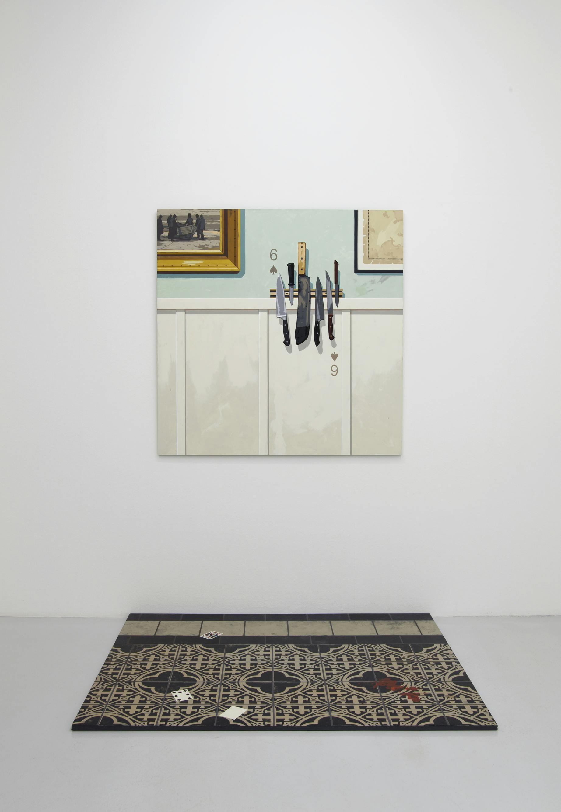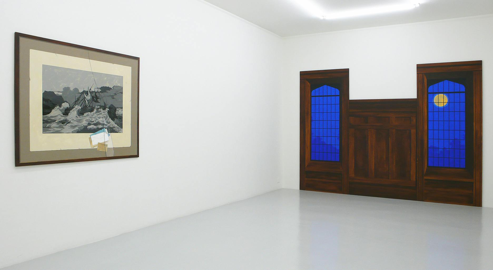 In addition to his study of magic, Benedict has been working on a new pictorial idiom that draws on venerable visual traditions. The Shipwreck and The Letters Home is painted to look like a large framed print behind broken glass, with a small scattering of letters and postcards between glass and image. The painting depicts the “Princess Augusta” that ran aground in 1783 off Block Island, Rhode Island, where it capsized, gradually acquiring a new life as a ghost ship that was believed to appear periodically as a fiery glow on the horizon. The trompe l’oeil effect underscores the magical impact of this legendary tale. The same applies to the quodlibet Three Wands (The Lord of Established Strength), an illusionist painting of three framed magic wands on red velvet, which belongs to the artist: on top the leg of a piano stool, in the middle a brotherhood torch of the 19th century, and on the bottom a magician’s wand. The playing card underneath, a three of clubs, is known in tarot as the “Lord of Established Strength,” a title indicating its divinatory significance.