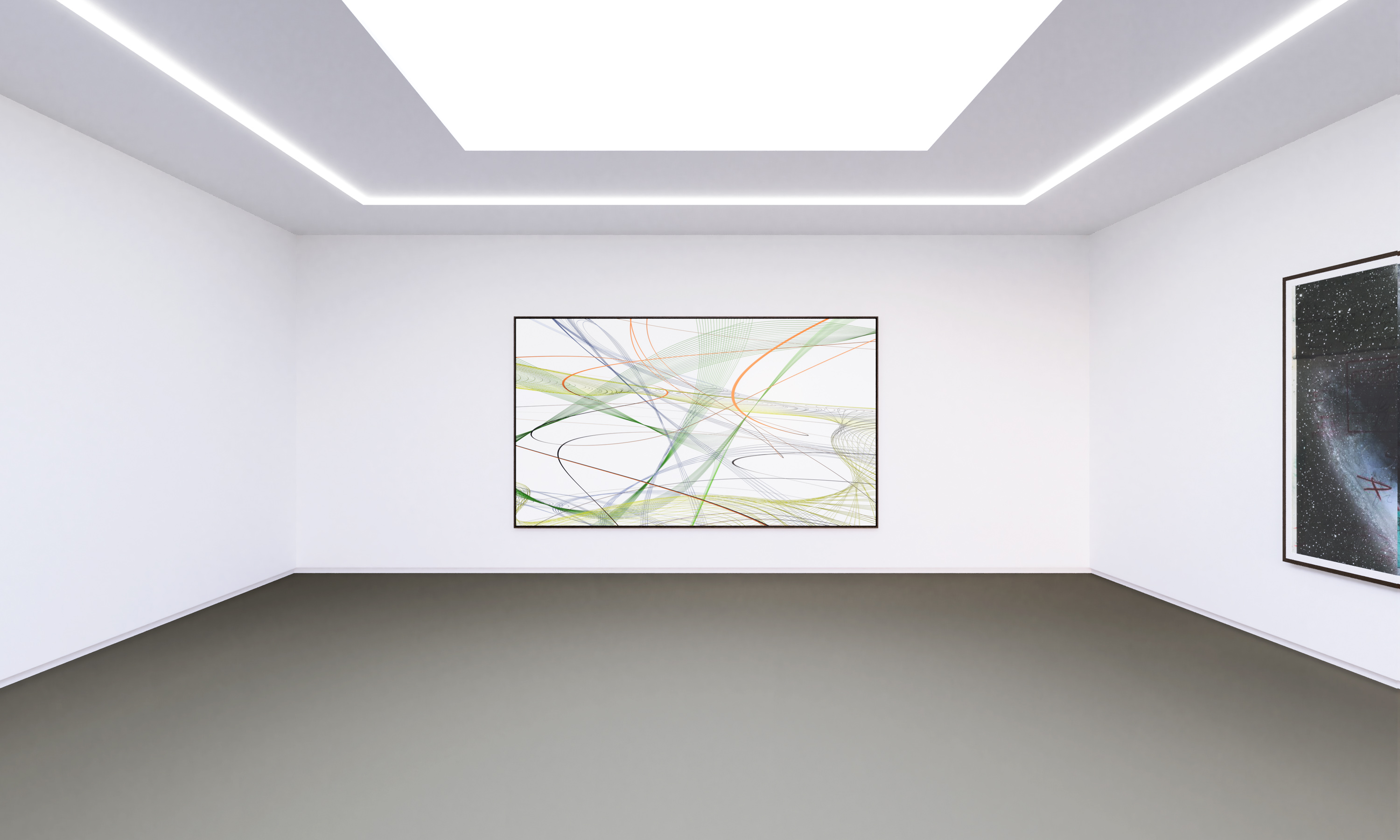 Inspired by drawings found in 19th-century antiquarian books on electromagnetism, the artist used a computer program to visualize and process complex formula of linear algebra to construct zycles’ three-dimensional tangles of lines. The structures represent intrinsically logical curves, such that you can no longer discern their origin in mathematics. Instead, they bring to mind planetary orbits, the lines of magnetic fields, curved strips or loops, line drawings in abstract art, or musical oscillations. In addition, the abstract, wildly colored and vaguely geometric forms of the cassini series were taken from an archive of satellite images of Saturn and its moons, provided by the NASA online. In September 2017, the Cassini probe got in the worldwide news, deliberately disposed of via a controlled fall into Saturn’s atmosphere, ending its nearly two-decade-long mission space probe Furthermore, dedicating himself to work with original copies of the 1212 negatives of the «European Southern Observatory» (ESO) archive lead to the monumental stars series.