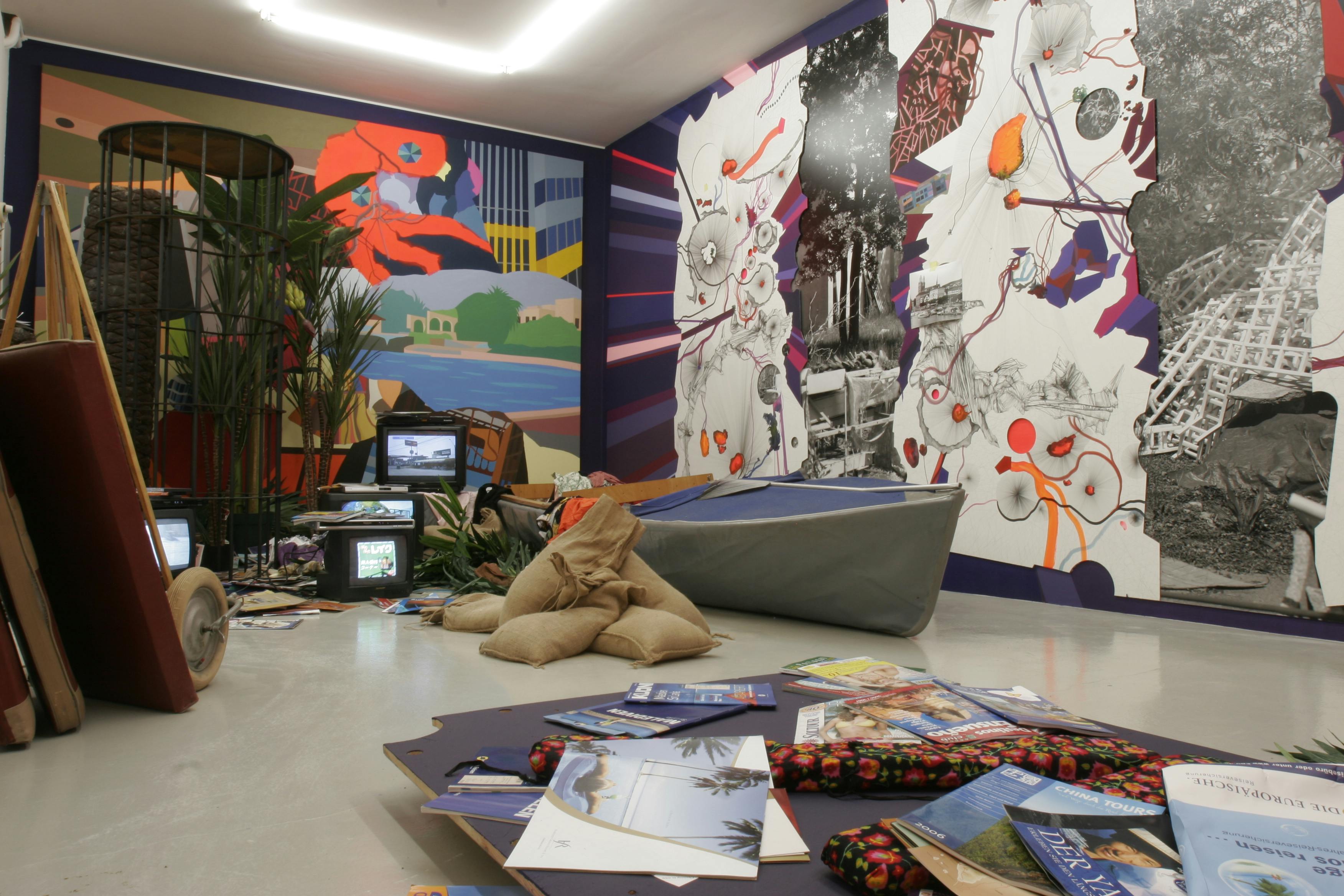 Franz Ackermann enjoys travelling, and he records his impressions of his frequent journeys and cultural and colour experiences in his famous „Mental Maps“. These are not real sketches, but small water colours which he develops into large-format, frequently dynamic canvases or projects onto the walls of exhibition premises. This results in intensively colourful compositions that oscillate between figuration and abstrac- tion. Some of his works are combined with sculptural elements, others with photographic moments. In addition to his travel experiences, Ackermann‘s work includes phenomena such as globalisation, mobility, thehecticdevelopmentofinformationtechnology,andacceleratedperception. WhenFranzAckermann sets up an exhibition, he responds to the given situation of the exhibition venues in terms of both form and content. His equipment consists of the „Mental Maps“ and his large-format images, which are intentionally unfinished, as well as photographs and sculptural objects. When he is not painting directly on a wall, he often works on the paintings, which usually have small, white patches on which he can respond to situati- onal events or political happenings, in the exhibiting gallery. In this way, he brings an element of flow to the predominantly lethargic medium of oil painting, as well as creating new works for almost every exhibition.