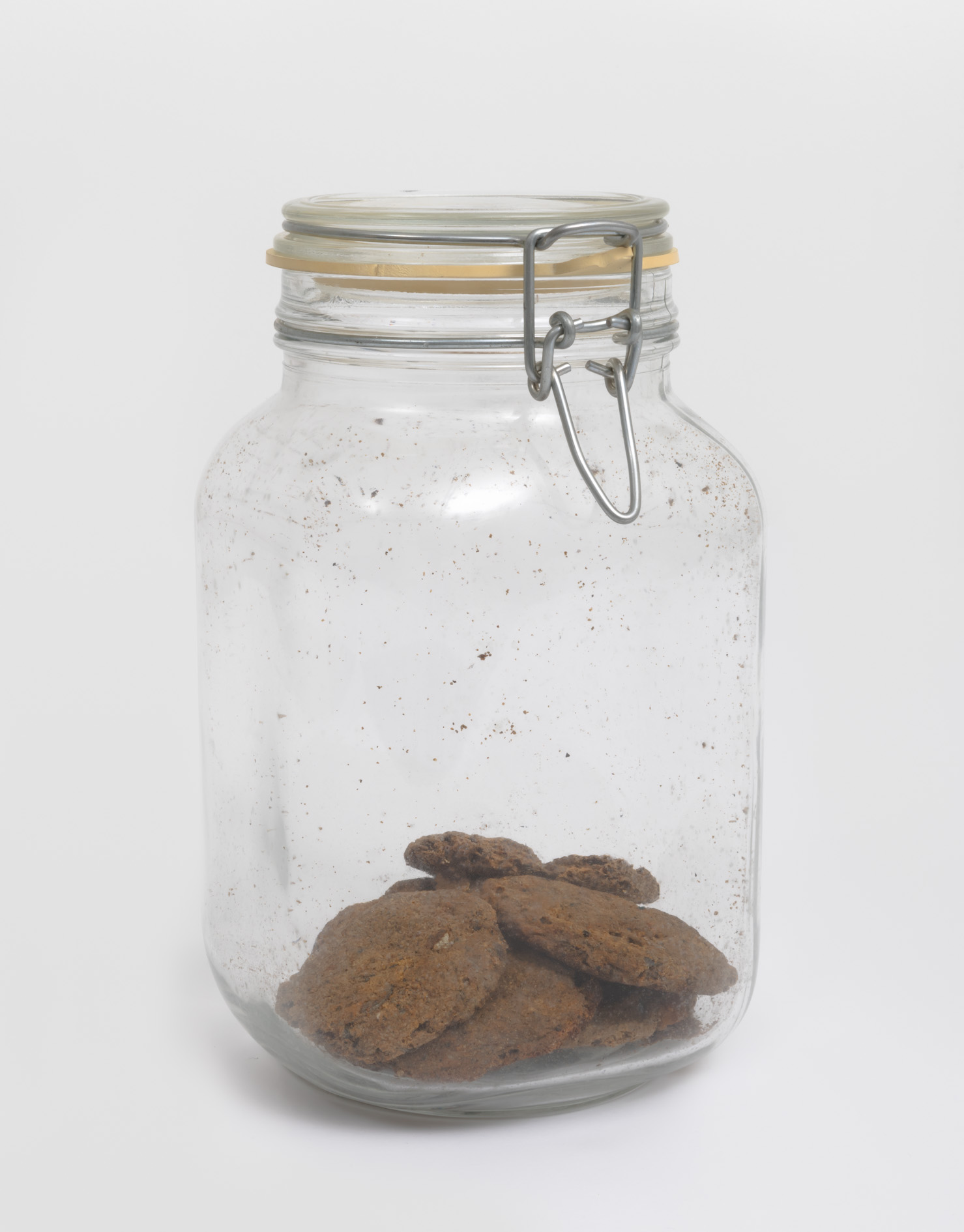 The exhibition starts with remains of the historic work “The Cremation Project” from 1970. In 1970, Baldessari radically decided to burn all paintings he had made between 1953 and 1966 and baked their ashes into cookies and placed them in a glass urn. This act marked the beginning of a new phase for Baldessari—namely the juxtaposition of text and image.