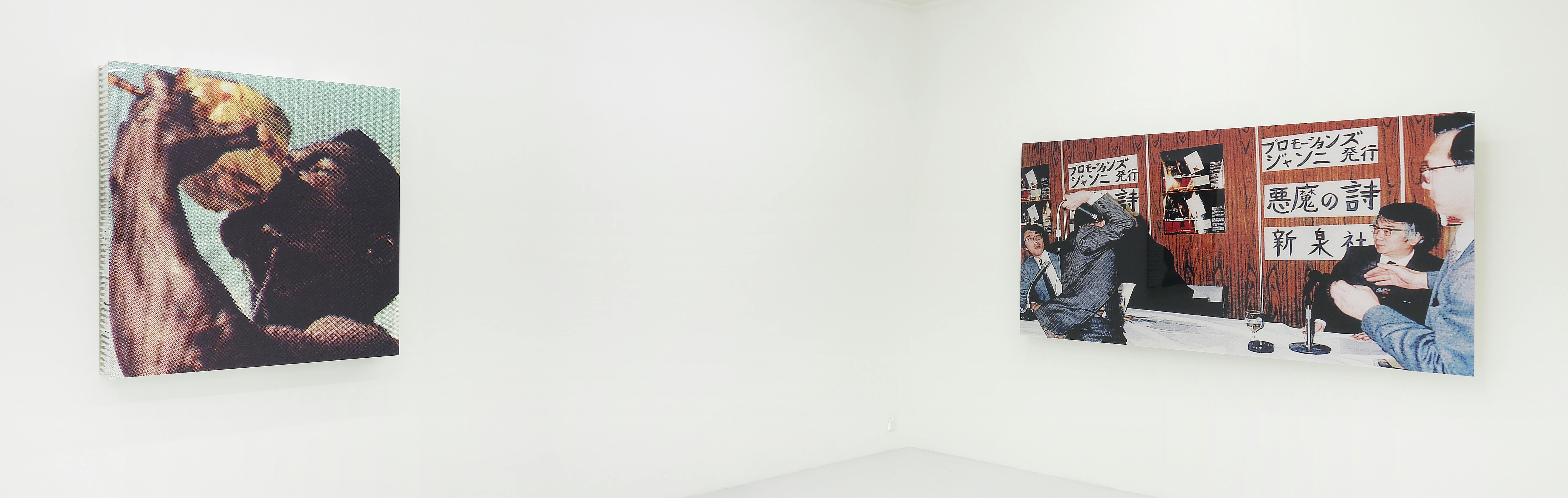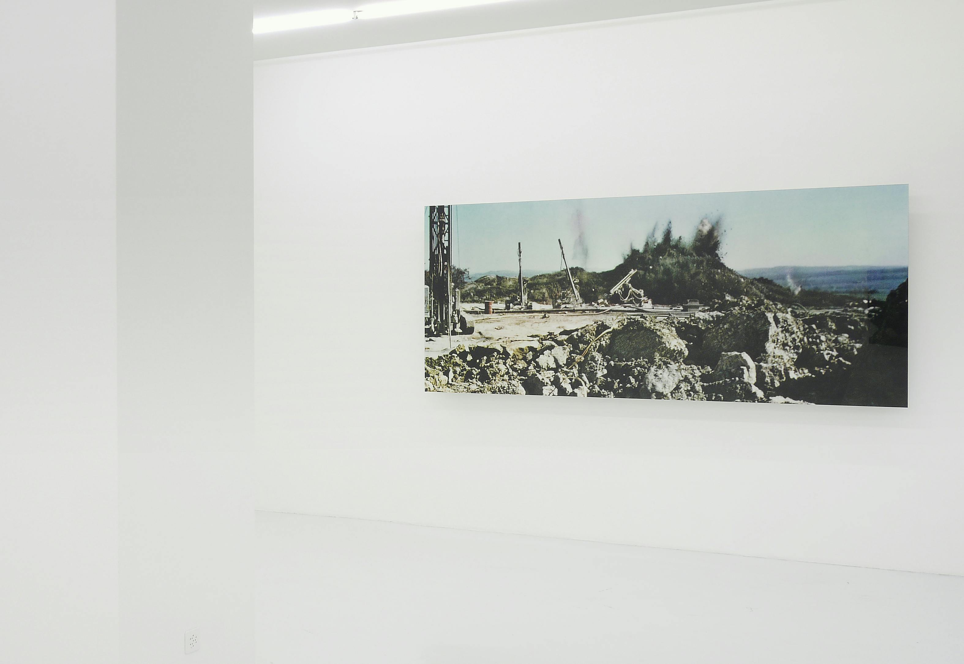 The motifs in the Reproductions have all had a previous life or career, as it were, having been created under very different circumstances as industrial or advertising photographs. What interests Müller about these images, which seem to float in front of the wall, is their purity of expression irrespective of date or place. In this respect, the Reproductions become images in their own right. A large, landscape format print, its brilliance heightened by the use of Cibachrome under acrylic , shows an explosion in the background and small drilling rigs dotted across the picture plane. The colours appear strangely alien, while the compositional structure is that of ideal landscape portrayals. What is particularly striking, however, is the impression of the destruction of a setting that is itself man- made, as though civilisation was self-destructing (Nylon, 2013). Whether this is a scene orchestrated for visual purposes or whether it is a vintage documentary picture is unknown and, indeed, unimportant for the context is missing, as though excised. Japan II, 2013 looks similarly alien and striking. It is a large-format print of an aggressive scene. A person sitting behind a table is being attacked a man in front of the table. He has grabbed a microphone that the others were presumably using for (perhaps) a press conference. Here, too, there is an overall sense of alienation. The Japanese writing on the wall and the supposed communicative aspect of the scene are not entirely decipherable to a viewer who is unfamiliar with the language. This generates a sense of detachment based on exoticism – an age-old theme that still has validity, all the more so in the political context of today.