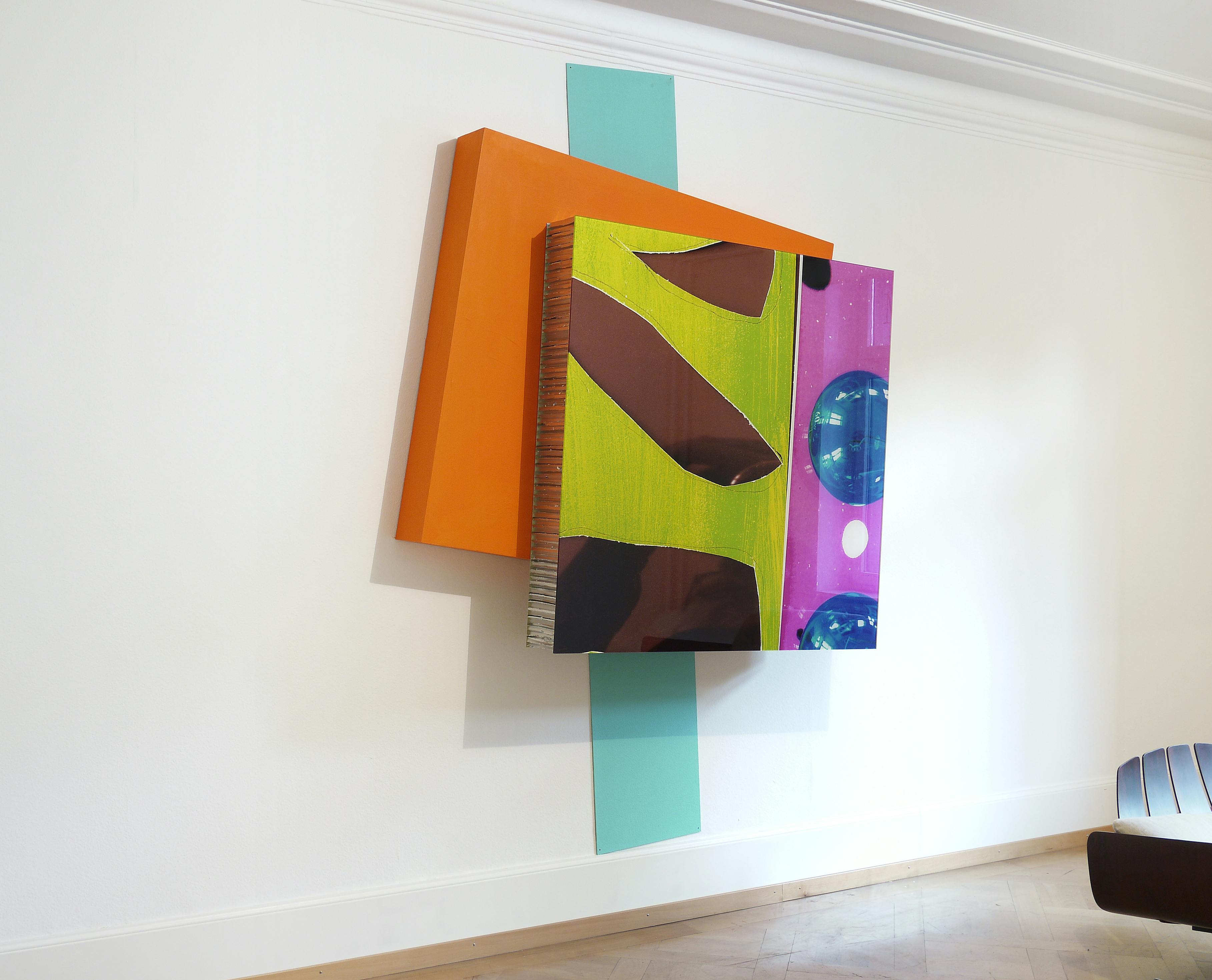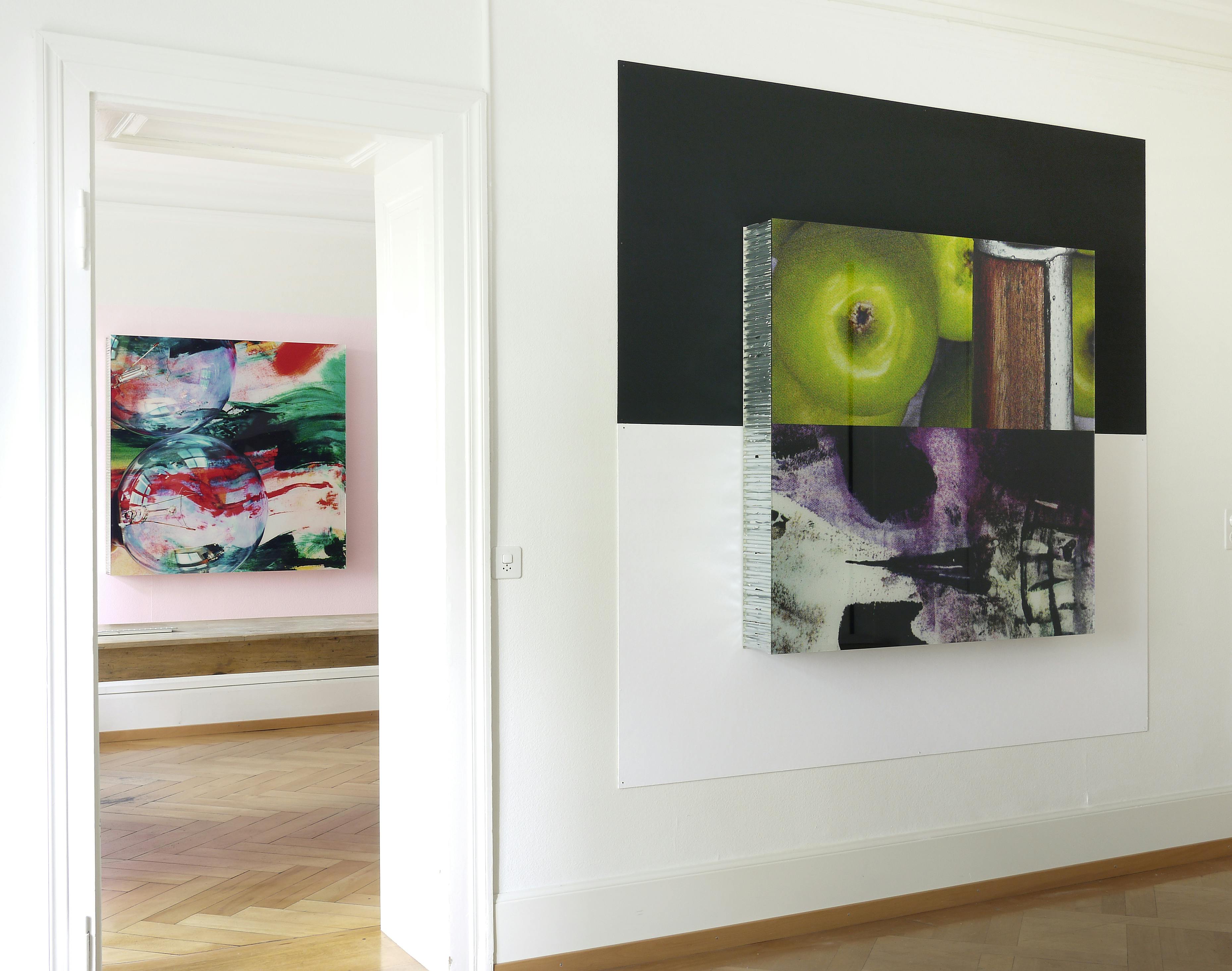 Another group of works, called Cuts, appears technoid and abstract: cuts, space and collage, plane and colour. Cropped photographic images are mounted on a metal panel with an open honeycomb structure, closed only by the picture itself on the front and the wall at the back. The strangely coloured, grainy images show, for instance, a young black man thirstily drinking from a coconut. It is the image of a cliche: youth, South Seas, health, etc. merge into a vision of yearning that is clearly entirely artificial, set against a brightly painted wall. Still other works combine found images, both photographed and collaged, into bewildering visual experiences. These visual sculptures or wall pieces are layered to form colourful volumes and planes, whereby image, pictorial space and background material all outshine each other in brightness, with the metal of the carrier reflecting at the sides. This juxtaposition of cropping, colour, planarity and three-dimensionality eludes categorisation. Through their colority, the works command and dominate the space, their radiance filling the room and captivating the viewer.