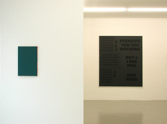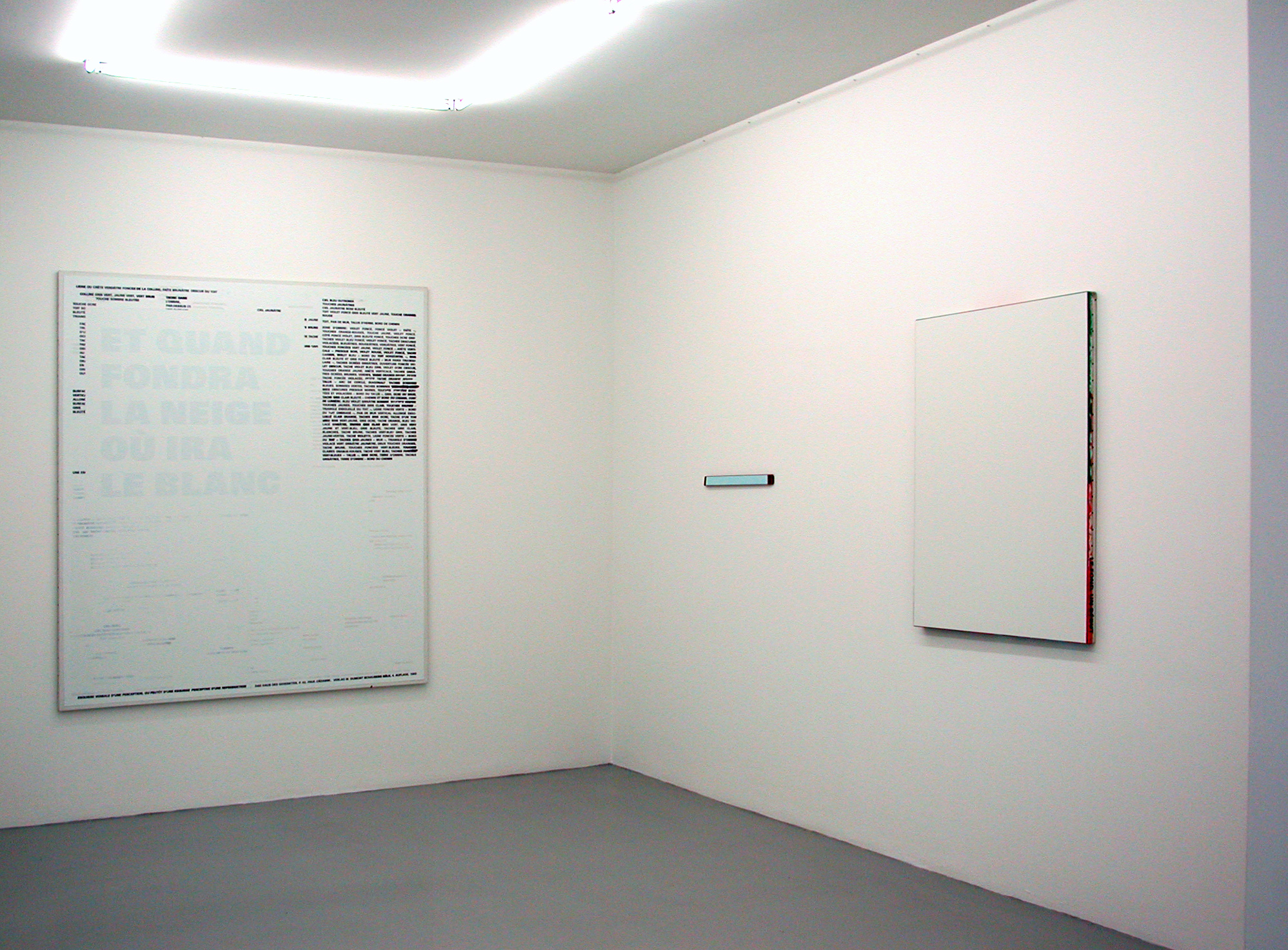 The exhibition in the Galerie Mai 36, which combines selected works from all the artist's creative stages and thus affords a specific view of his work, was conceived by the artist himself. It throws light on the discussion about the conditions of the image and its perception in his early works, which direct the viewer's attention specifically to the individual elements of the image. The use of language serves primarily as a commentary and a means of analysis. The frequently paradox situation of the image in space, which can refer to something outside itself – for example in the series, dating from 1994, entitled NOT HERE – is just as much as a subject for reflection as the limits of its perceptibility in the group Tableau Aveugle 1986-1991). In the mid-1980s, however, Rémy Zaugg tended to regard the image more and more frequently as a subject for linguistic articulation as well, a subject that entered into a dialogue with the viewer. In evocative speech- images of crystalline beauty, it challenges the viewer to engage in active participation in the constitution of the pictures, for example in ET QUAND/FORNDRA/LA NEIGE/OÙ IRA/LE BLANC (2002/2003). In fact, this can lead to the inversion of the traditional relationship between the image and the viewer, when the image gives us to understand, for example: DOCH ICH, /DAS BILD, /ICH DENKE/MENSCH (2002).