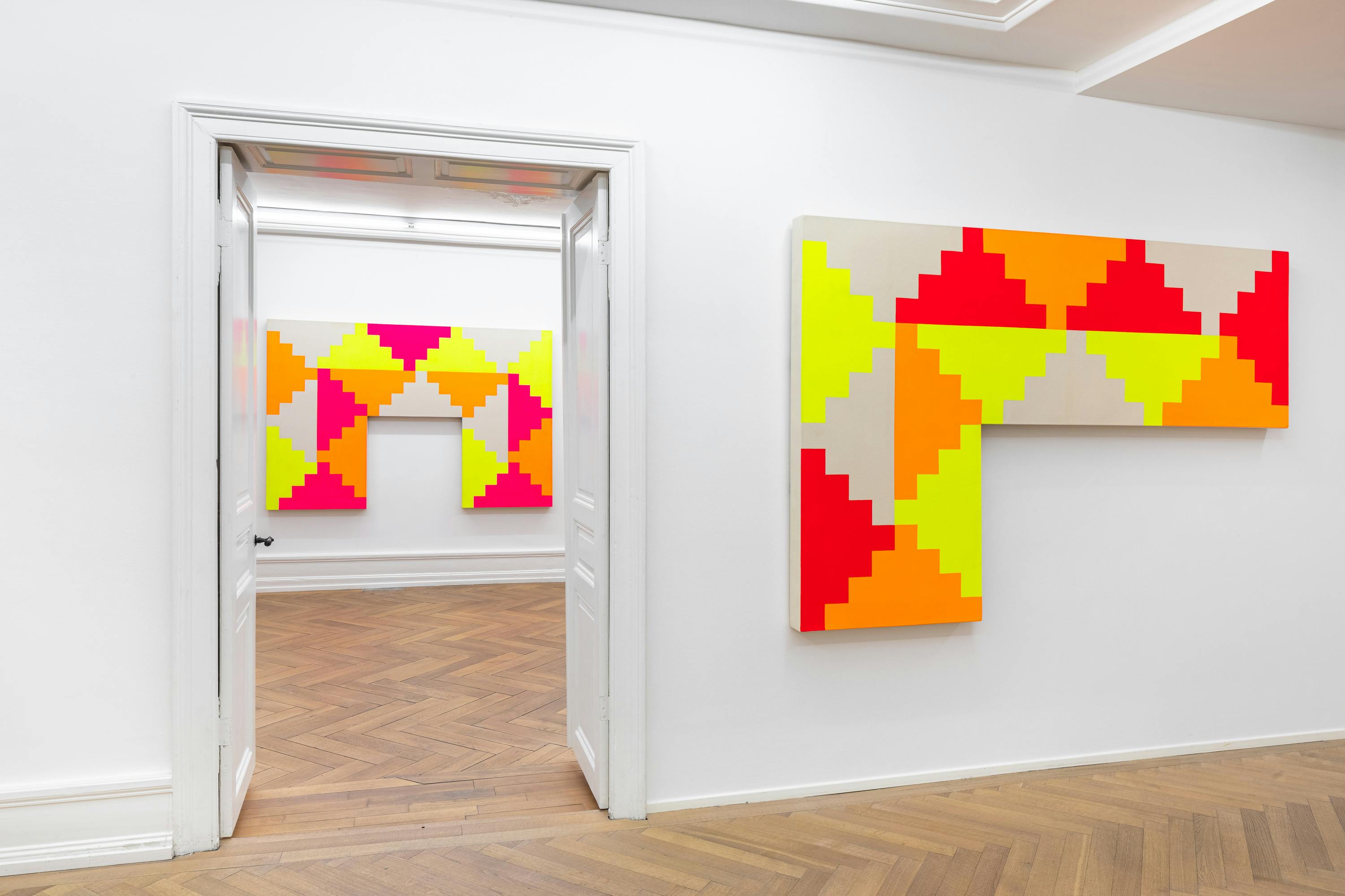 It was Felix Partz who first introduced the Ziggurat motif in a series of paintings from 1968–69, predating the formal establishment of General Idea as a collective. After returning from a trip to North Africa, he brought with him the Ziggurat, a pattern that seemed to have taken root in his mind—whether influenced by the tiered structures of Mesopotamia and Egypt or the intricate designs of tribal carpets remains uncertain. In 1986, the group revisited the Ziggurat motif, completing unfinished sketches from Partz’s earlier series.
