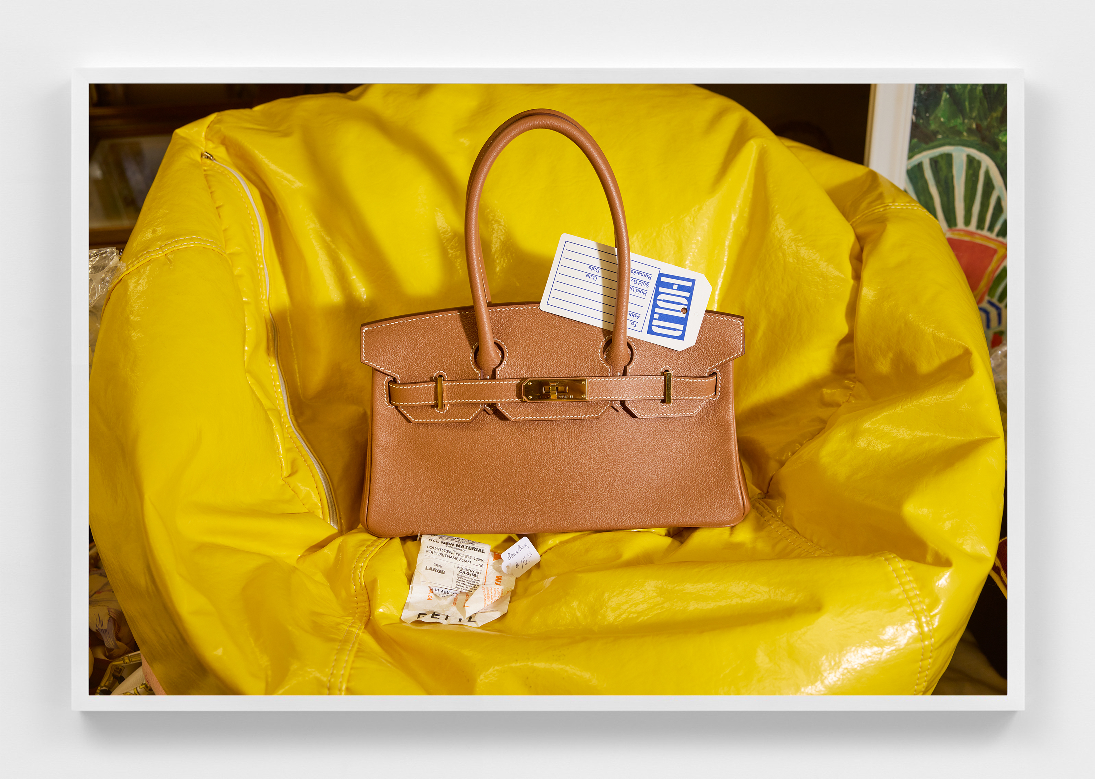 Many works in Sensible Shoes began in commercial settings, where accident and art direction meet. A self-portrait emerged when a scheduled model canceled and Ethridge stepped in; others, like the Birkin Hermès Bag, originated from a meticulously planned shoot for Palmer magazine. ...However because it was shot at a thrift store in Palm Beach the juxtaposition of a cheap yellow beanbag with a the luxury hand bag was a spontaneous, unplanned gesture.