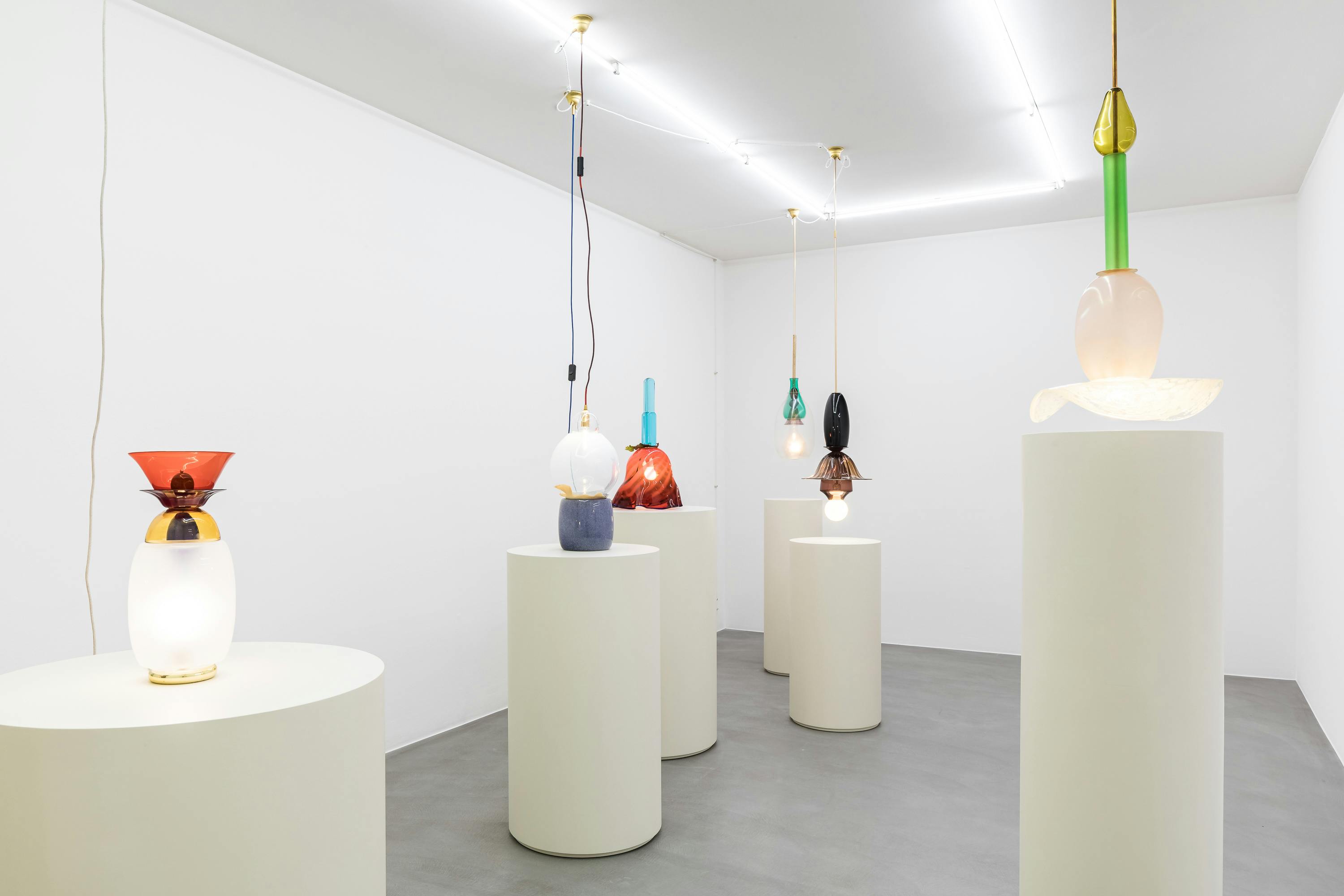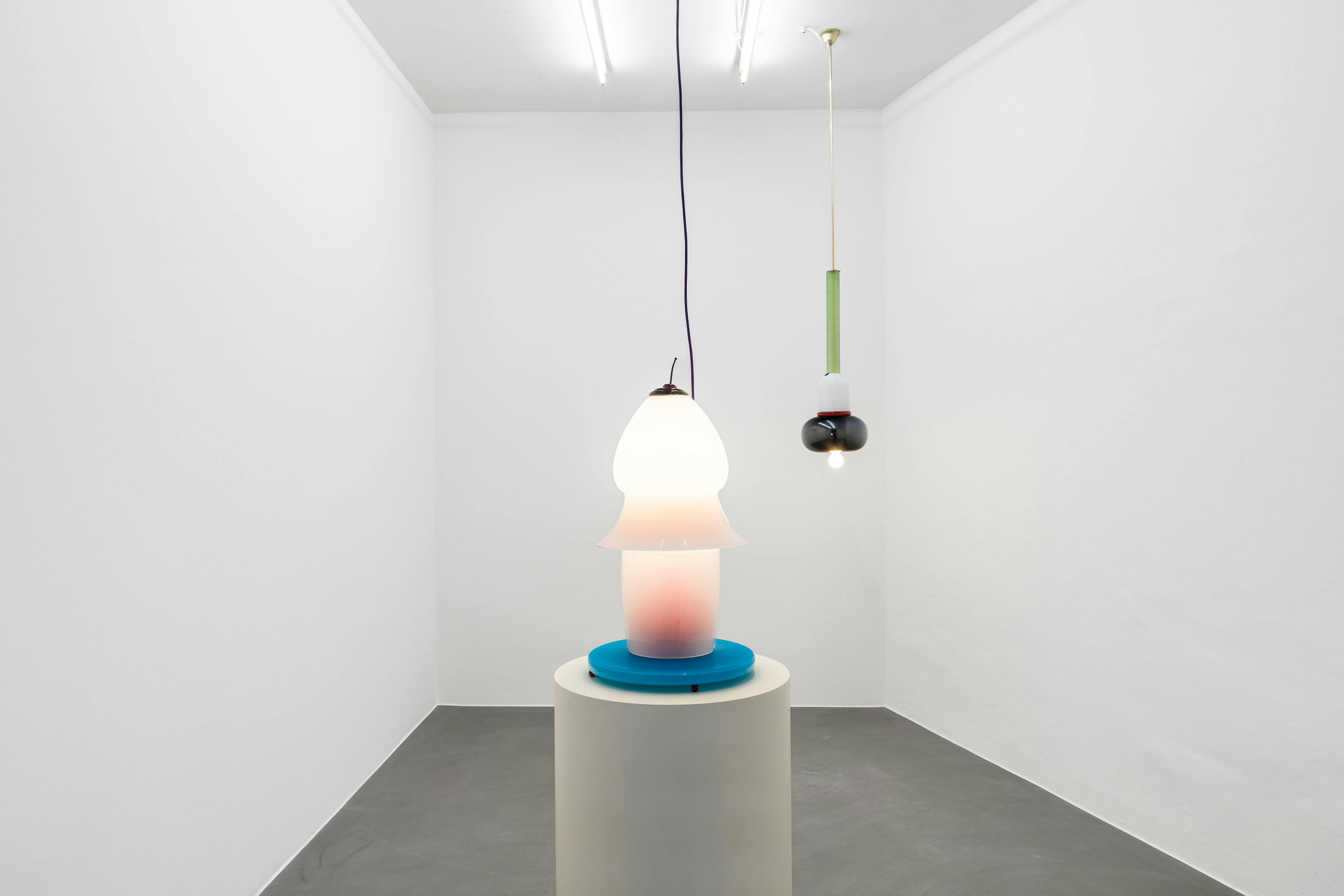 In recent years, the artist has regularly visited the island of Murano, known since the Middle Ages for its renowned Venetian glassmaking. For the lamp-works on view, he selected each piece from a “glass sanatorium” where spare, broken, and discarded glass is kept. This results in a juxtaposition of different time periods and styles: a remnant from the 1990s sits alongside a 1930s casualty, Venini-esque pieces and blown glass hallmarked Barovier are paired with more modest items. The chandeliers straddle the line between functional and sculptural, allowing the artist to explore themes of artistic and design production, as well as the history of display. Notably, Dedobbeleer has consistently shown a strong interest in exhibition accessories such as podiums, wall hooks or even radiator covers. Here, he cleverly addresses the issue of lighting in gallery spaces by designing the works themselves to emit light.