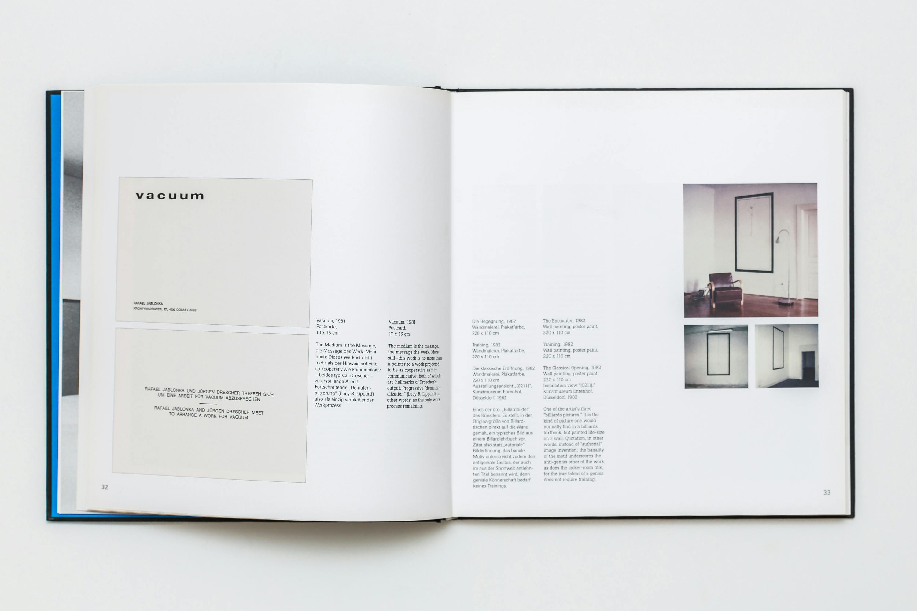 The long and quite eventful artistic career of the conceptual video, text, image, performance, and object artist Jürgen Drescher is presented clearly for the first time in this publication. Jürgen Drescher studied with Klaus Rinke at the Düsseldorf Art Academy and caused a sensation in the 1980s with his "Bar" projects (in collaboration with Reinhard Mucha). Jürgen Drescher experienced his first highlights with solo exhibitions at the Kunsthalle Zürich and his appearance in the Aperto at the Venice Biennale. This publication focuses on the various areas of his artistic work over the past 25 years, with a special emphasis on the cast objects created in the past five years.